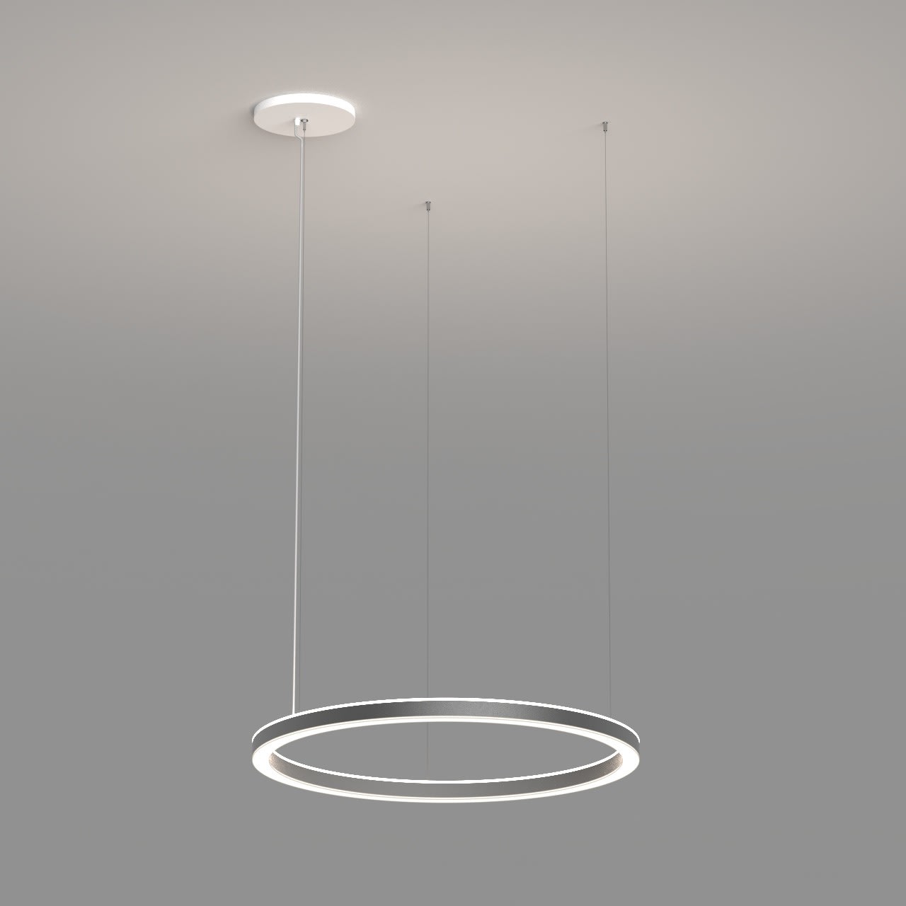 Anneau lumineux LED de grande qualité avec boîtier de luminaire au design minimaliste, en tôle d’acier soudée sans soudure apparente avec surface thermolaquée en argent ’RAL9006’, structure fine mate, pour montage en suspension, pour éclairage direct/indirect, comparable 1:1. Installation par 3 filins de suspension 1500 mm avec fixation-tendeur rapide et gabarit de forage, avec réglage de la longueur. Raccordement électrique par 5 pôles utilisés et patère de plafond, 270x40 mm (DMxH). Positionnement de la patère au choix, centré ou latéral. Diffuseurs direct et indirect en PMMA satiné pour un éclairage homogène, de 7 mm de haut pour la diffusion latérale. Luminaire équipé d’une technologie LED innovante avec une efficacité de 61 lm par W et une flux lumineux sortant de Convertisseur DALI pour gradation inclus, Nombre d''adresses DALI : 2, Evaluation de l''éblouissement selon la classification selon DIN EN 12464-1.2021-11 avec UGR < 19, Indice de rendu des couleurs (IRC) > 90, tolérance chromatique étroite MacAdam 3, Indice de protection IP40, classe de protection I, Groupe de risque RG = 0 selon norme IEC 62471, durée de vie nominale > 60.000 h [selon le décret de l’UE]. option de commutateur : C, Dimensions DMxH : 1220x062 mm, largeur de la section 54 mm. Poids : 15.0 kg