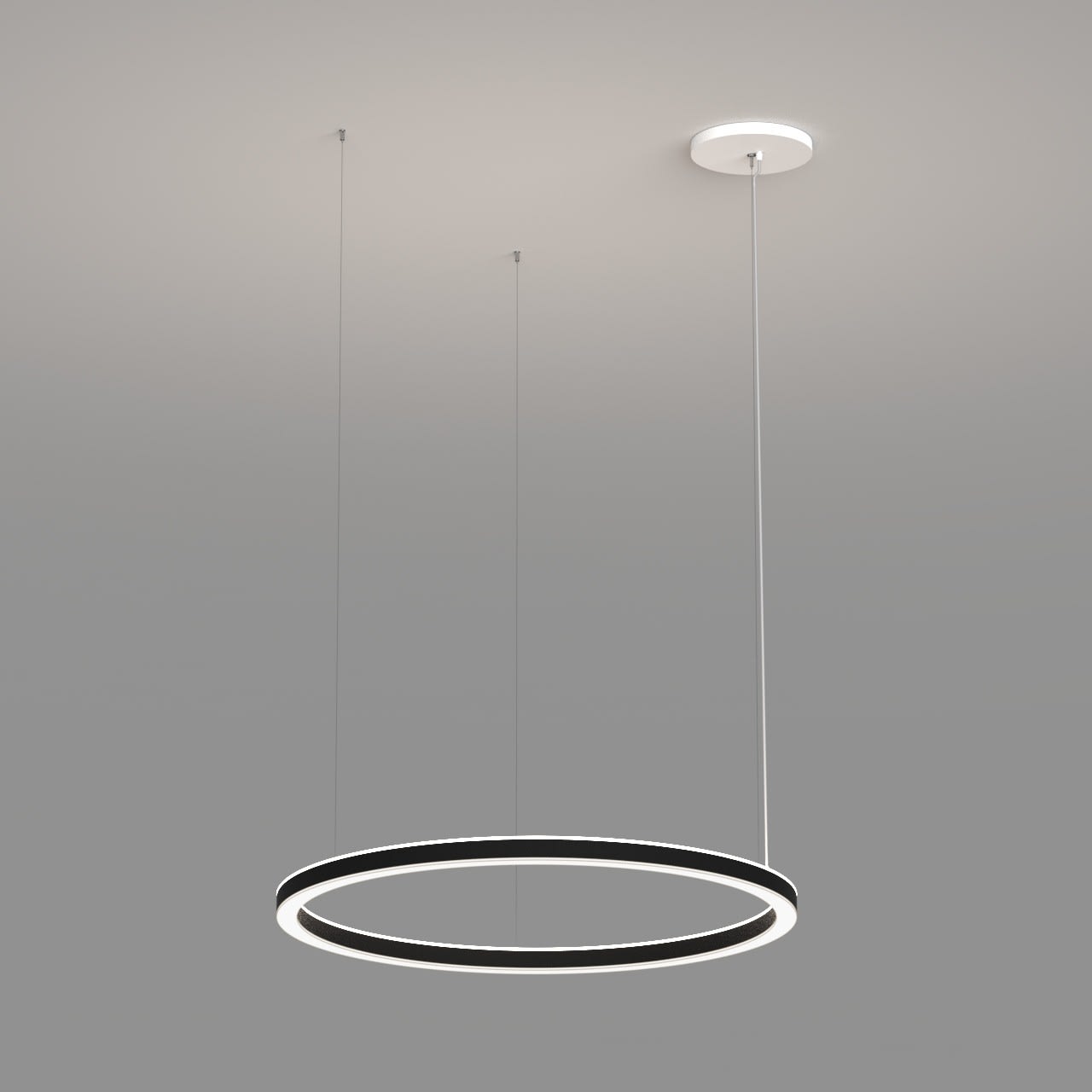 Anneau lumineux LED de grande qualité avec boîtier de luminaire au design minimaliste, en tôle d’acier soudée sans soudure apparente avec surface thermolaquée en noir ’RAL9005’, structure fine mate, pour montage en suspension, pour éclairage direct/indirect, comparable 1:1. Installation par 3 filins de suspension 1500 mm avec fixation-tendeur rapide et gabarit de forage, avec réglage de la longueur. Raccordement électrique par 3 pôles utilisés et patère de plafond, 270x40 mm (DMxH). Positionnement de la patère au choix, centré ou latéral. Diffuseurs direct et indirect en PMMA satiné pour un éclairage homogène, de 7 mm de haut pour la diffusion latérale. Luminaire équipé d’une technologie LED innovante avec une efficacité de 66 lm par W et une flux lumineux sortant de Convertisseur inclus, Evaluation de l''éblouissement selon la classification selon DIN EN 12464-1.2021-11 avec UGR < 19, luminaire de poste de travail compatible écran selon DIN EN 12464-1 (luminosité à 65° <= 3000 cd/m²), Indice de rendu des couleurs (IRC) > 90, tolérance chromatique étroite MacAdam 3, Indice de protection IP40, classe de protection I, Groupe de risque RG = 0 selon norme IEC 62471, durée de vie nominale > 60.000 h [selon le décret de l’UE]. option de commutateur : A, Dimensions DMxH : 1360x062 mm, largeur de la section 54 mm. Poids : 18.0 kg