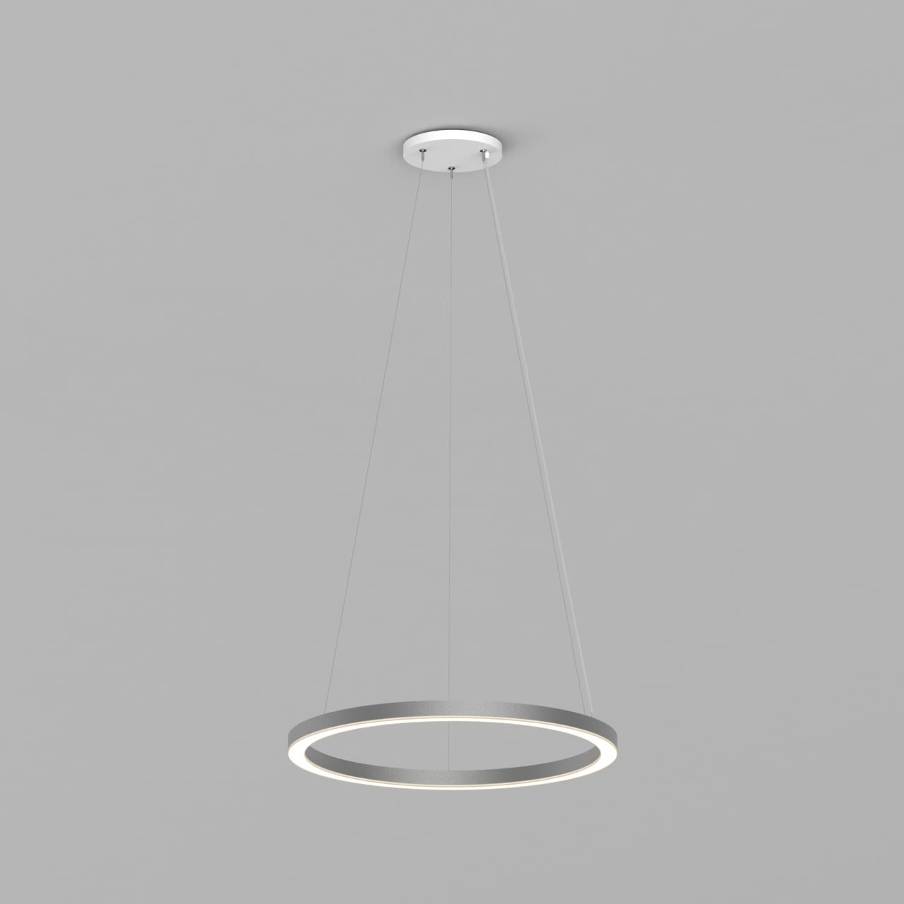 Anneau lumineux LED de grande qualité avec boîtier de luminaire au design minimaliste, en tôle d’acier soudée sans soudure apparente avec surface thermolaquée en argent ’RAL9006’, structure fine mate, pour montage en suspension, pour éclairage direct. Installation par 3 filins de suspension 2000 mm avec fixation-tendeur rapide, avec réglage de la longueur. Raccordement électrique par 5 pôles utilisés et patère de plafond, 270x47 mm (DMxH). Positionnement de la patère au choix centré. La distance minimale entre 600 mm. Diffuseuren PMMA satiné pour un éclairage homogène, de 7 mm de haut pour la diffusion latérale. Luminaire équipé d’une technologie LED innovante avec une efficacité de 60 lm par W et une flux lumineux sortant de Convertisseur DALI pour gradation inclus, Nombre d''adresses DALI : 1, Evaluation de l''éblouissement selon la classification selon DIN EN 12464-1.2021-11 avec UGR < 22, Indice de rendu des couleurs (IRC) > 90, tolérance chromatique étroite MacAdam 3, Indice de protection IP20, classe de protection I, Groupe de risque RG = 0 selon norme IEC 62471, durée de vie nominale > 60.000 h [selon le décret de l’UE]. option de commutateur : C, Dimensions DMxH : 1040x055 mm, largeur de la section 54 mm. Poids : 14.0 kg