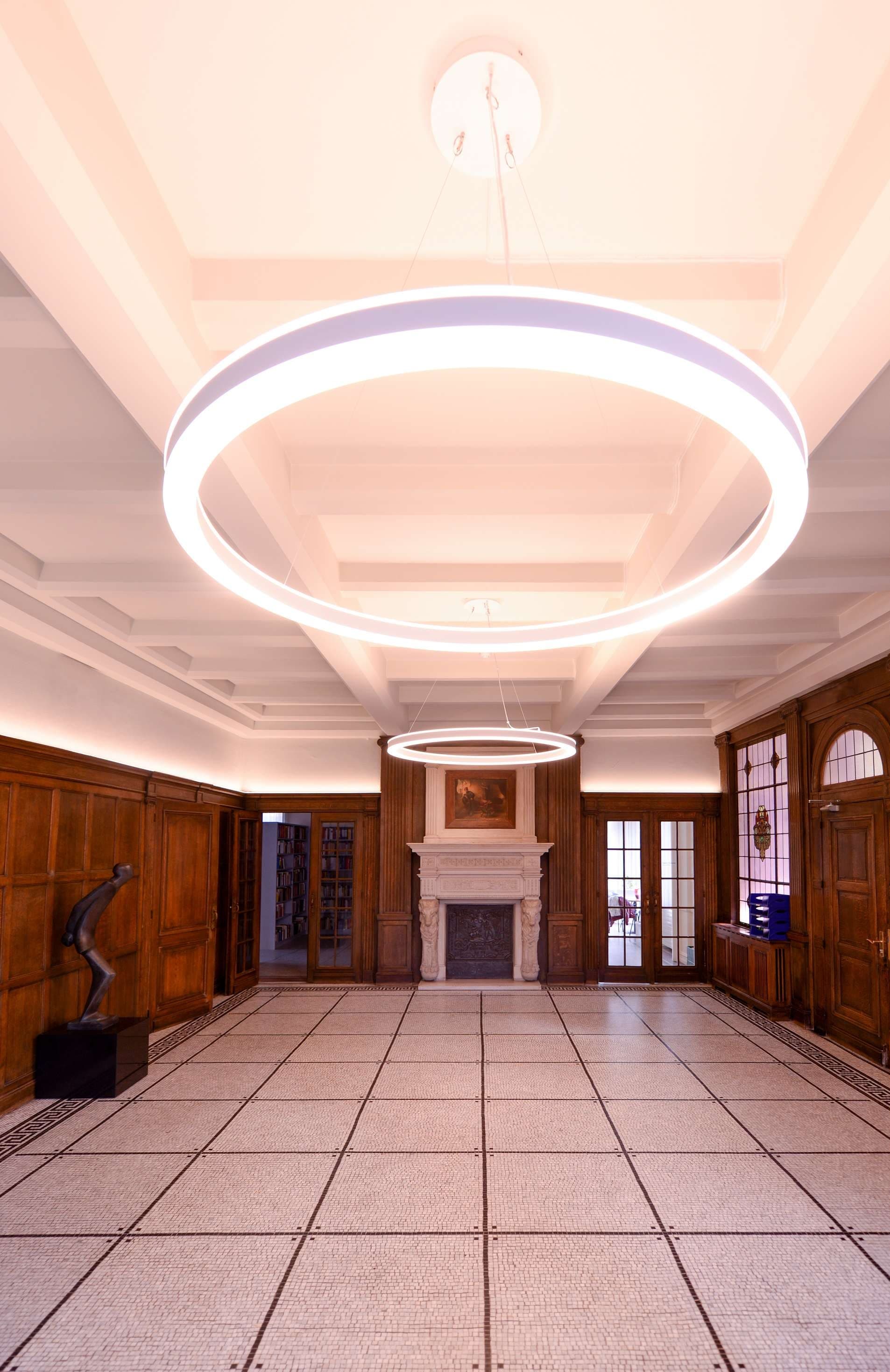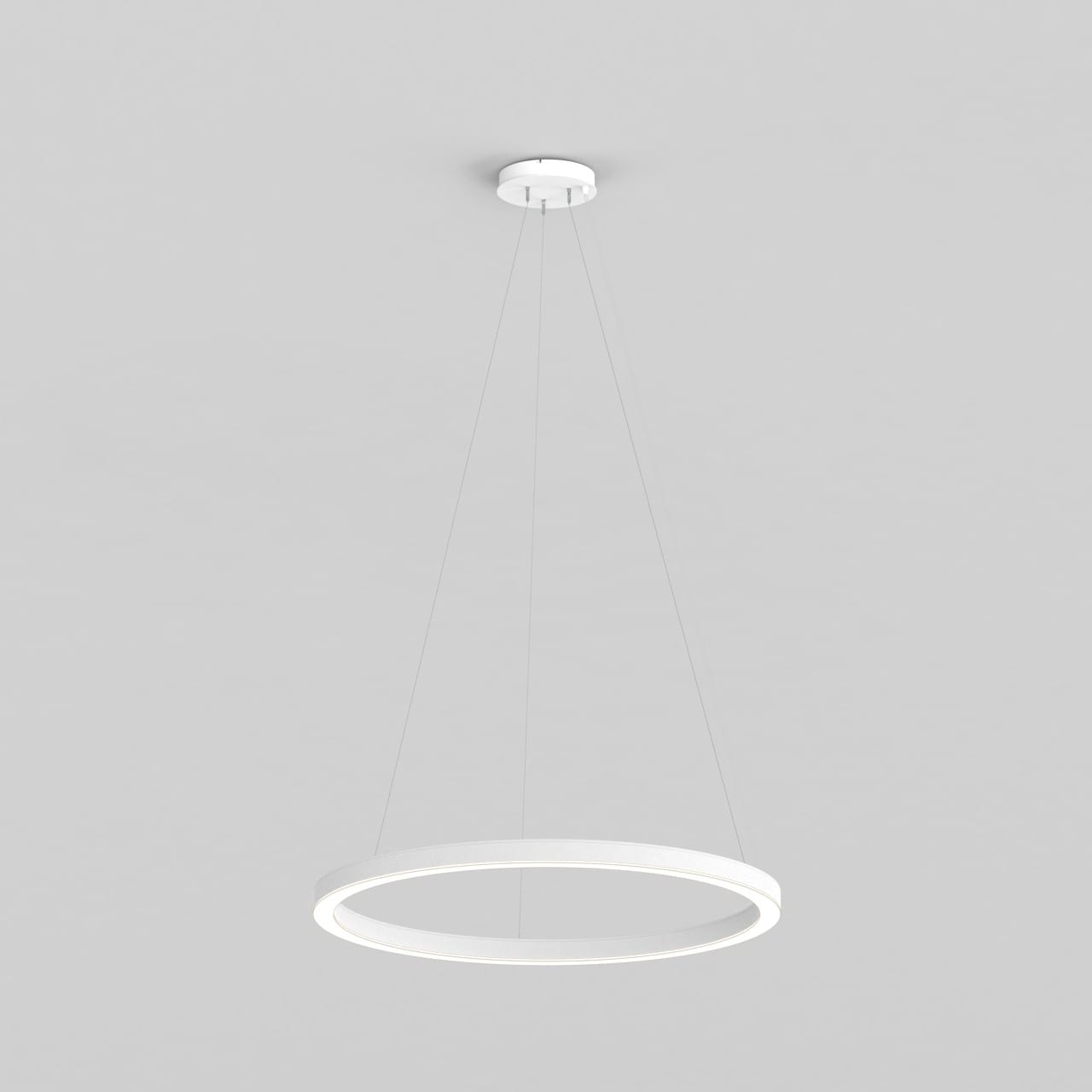 Anneau lumineux LED de grande qualité avec boîtier de luminaire au design minimaliste, en tôle d’acier soudée sans soudure apparente avec surface thermolaquée en blanc ’RAL9016’, structure fine mate, pour montage en suspension, pour éclairage direct. Installation par 3 filins de suspension 2000 mm avec fixation-tendeur rapide, avec réglage de la longueur. Raccordement électrique par 5 pôles utilisés et patère de plafond, 270x47 mm (DMxH). Positionnement de la patère au choix centré. La distance minimale entre 600 mm. Diffuseuren PMMA satiné pour un éclairage homogène, de 7 mm de haut pour la diffusion latérale. Luminaire équipé d’une technologie LED innovante avec une efficacité de 81 lm par W et une flux lumineux sortant de Convertisseur DALI pour gradation inclus, Nombre d''adresses DALI : 1, Evaluation de l''éblouissement selon la classification selon DIN EN 12464-1.2021-11 avec UGR < 22, Indice de rendu des couleurs (IRC) > 90, tolérance chromatique étroite MacAdam 3, Indice de protection IP20, classe de protection I, Groupe de risque RG = 0 selon norme IEC 62471, durée de vie nominale > 60.000 h [selon le décret de l’UE]. option de commutateur : C, Dimensions DMxH : 1220x055 mm, largeur de la section 54 mm. Poids : 15.0 kg