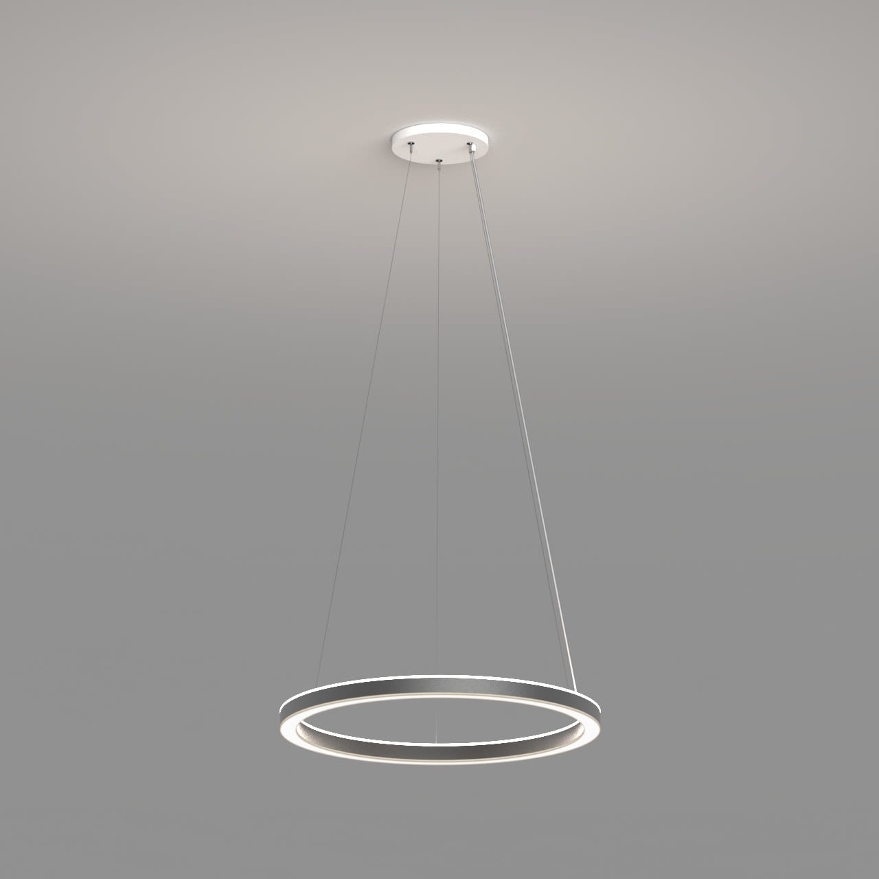 Anneau lumineux LED de grande qualité avec boîtier de luminaire au design minimaliste, en tôle d’acier soudée sans soudure apparente avec surface thermolaquée en argent ’RAL9006’, structure fine mate, pour montage en suspension, pour éclairage direct/indirect, comparable 1:1. Installation par 3 filins de suspension 2000 mm avec fixation-tendeur rapide, avec réglage de la longueur. Raccordement électrique par 5 pôles utilisés et patère de plafond, 270x47 mm (DMxH). Positionnement de la patère au choix centré. La distance minimale entre 600 mm. Diffuseurs direct et indirect en PMMA satiné pour un éclairage homogène, de 7 mm de haut pour la diffusion latérale. Luminaire équipé d’une technologie LED innovante avec une efficacité de 58 lm par W et une flux lumineux sortant de Convertisseur DALI pour gradation inclus, Nombre d''adresses DALI : 2, Evaluation de l''éblouissement selon la classification selon DIN EN 12464-1.2021-11 avec UGR < 19, luminaire de poste de travail compatible écran selon DIN EN 12464-1 (luminosité à 65° <= 3000 cd/m²), Indice de rendu des couleurs (IRC) > 90, tolérance chromatique étroite MacAdam 3, Indice de protection IP40, classe de protection I, Groupe de risque RG = 0 selon norme IEC 62471, durée de vie nominale > 60.000 h [selon le décret de l’UE]. option de commutateur : C, Dimensions DMxH : 1040x062 mm, largeur de la section 54 mm. Poids : 14.0 kg