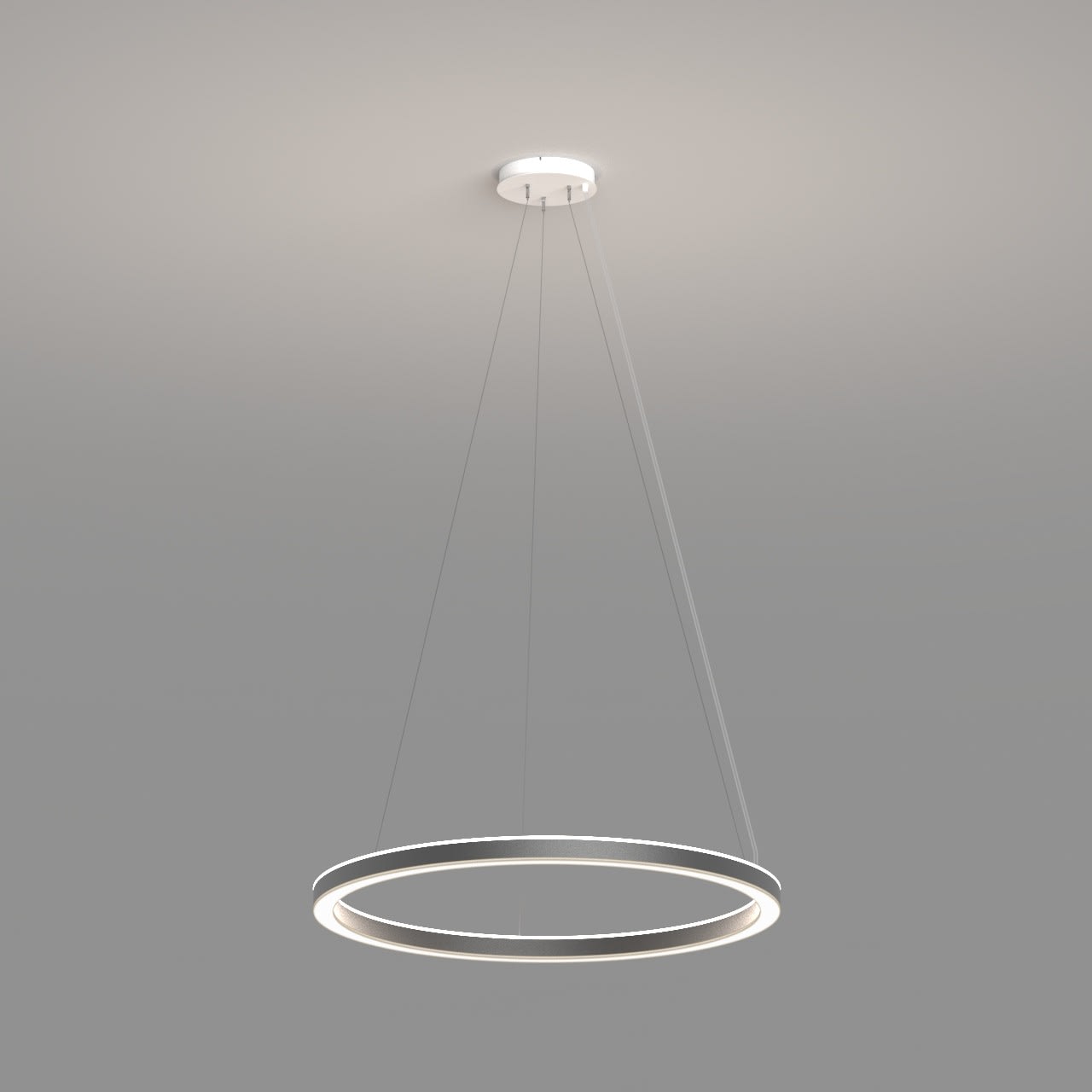 Anneau lumineux LED de grande qualité avec boîtier de luminaire au design minimaliste, en tôle d’acier soudée sans soudure apparente avec surface thermolaquée en argent ’RAL9006’, structure fine mate, pour montage en suspension, pour éclairage direct/indirect, comparable 1:1. Installation par 3 filins de suspension 2000 mm avec fixation-tendeur rapide, avec réglage de la longueur. Raccordement électrique par 5 pôles utilisés et patère de plafond, 270x47 mm (DMxH). Positionnement de la patère au choix centré. La distance minimale entre 600 mm. Diffuseurs direct et indirect en PMMA satiné pour un éclairage homogène, de 7 mm de haut pour la diffusion latérale. Luminaire équipé d’une technologie LED innovante avec une efficacité de 63 lm par W et une flux lumineux sortant de Convertisseur DALI pour gradation inclus, Nombre d''adresses DALI : 2, Evaluation de l''éblouissement selon la classification selon DIN EN 12464-1.2021-11 avec UGR < 19, Indice de rendu des couleurs (IRC) > 90, tolérance chromatique étroite MacAdam 3, Indice de protection IP40, classe de protection I, Groupe de risque RG = 0 selon norme IEC 62471, durée de vie nominale > 60.000 h [selon le décret de l’UE]. option de commutateur : C, Dimensions DMxH : 1220x062 mm, largeur de la section 54 mm. Poids : 15.0 kg