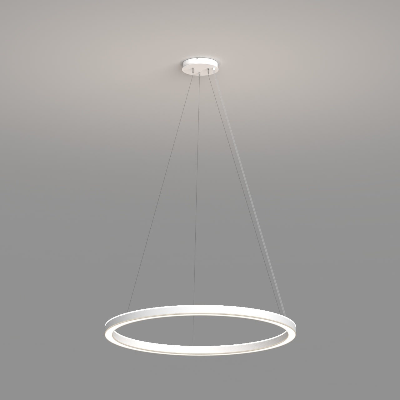 Anneau lumineux LED de grande qualité avec boîtier de luminaire au design minimaliste, en tôle d’acier soudée sans soudure apparente avec surface thermolaquée en blanc ’RAL9016’, structure fine mate, pour montage en suspension, pour éclairage direct/indirect, comparable 1:1. Installation par 3 filins de suspension 2000 mm avec fixation-tendeur rapide, avec réglage de la longueur. Raccordement électrique par 3 pôles utilisés et patère de plafond, 270x47 mm (DMxH). Positionnement de la patère au choix centré. La distance minimale entre 600 mm. Diffuseurs direct et indirect en PMMA satiné pour un éclairage homogène, de 7 mm de haut pour la diffusion latérale. Luminaire équipé d’une technologie LED innovante avec une efficacité de 85 lm par W et une flux lumineux sortant de Convertisseur inclus, Evaluation de l''éblouissement selon la classification selon DIN EN 12464-1.2021-11 avec UGR < 19, Indice de rendu des couleurs (IRC) > 90, tolérance chromatique étroite MacAdam 3, Indice de protection IP40, classe de protection I, Groupe de risque RG = 0 selon norme IEC 62471, durée de vie nominale > 60.000 h [selon le décret de l’UE]. option de commutateur : A, Dimensions DMxH : 1360x062 mm, largeur de la section 54 mm. Poids : 18.0 kg