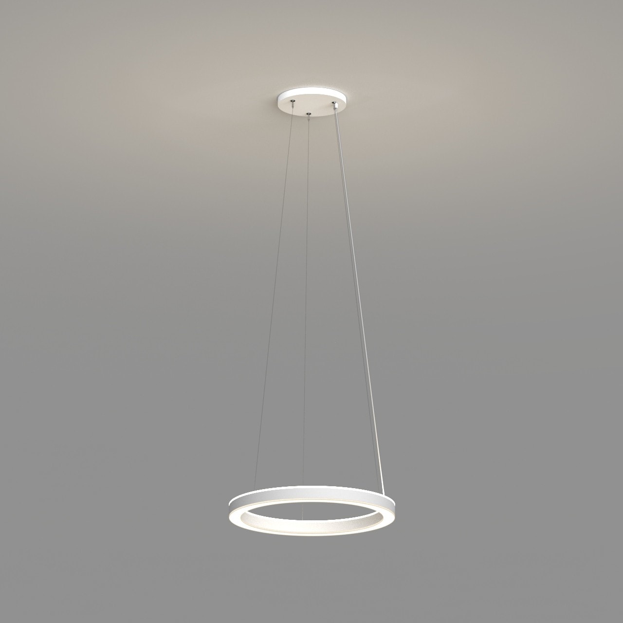Anneau lumineux LED de grande qualité avec boîtier de luminaire au design minimaliste, en tôle d’acier soudée sans soudure apparente avec surface thermolaquée en blanc ’RAL9016’, structure fine mate, pour montage en suspension, pour éclairage direct/indirect, comparable 1:1. Installation par 3 filins de suspension 2000 mm avec fixation-tendeur rapide, avec réglage de la longueur. Raccordement électrique par 5 pôles utilisés et patère de plafond, 270x47 mm (DMxH). Positionnement de la patère au choix centré. La distance minimale entre 600 mm. Diffuseurs direct et indirect en PMMA satiné pour un éclairage homogène, de 7 mm de haut pour la diffusion latérale. Luminaire équipé d’une technologie LED innovante avec une efficacité de 81 lm par W et une flux lumineux sortant de Convertisseur DALI pour gradation inclus, Nombre d''adresses DALI : 2, Evaluation de l''éblouissement selon la classification selon DIN EN 12464-1.2021-11 avec UGR < 22, Indice de rendu des couleurs (IRC) > 90, tolérance chromatique étroite MacAdam 3, Indice de protection IP40, classe de protection I, Groupe de risque RG = 0 selon norme IEC 62471, durée de vie nominale > 60.000 h [selon le décret de l’UE]. option de commutateur : C, Dimensions DMxH : 0760x062 mm, largeur de la section 54 mm. Poids : 10.0 kg