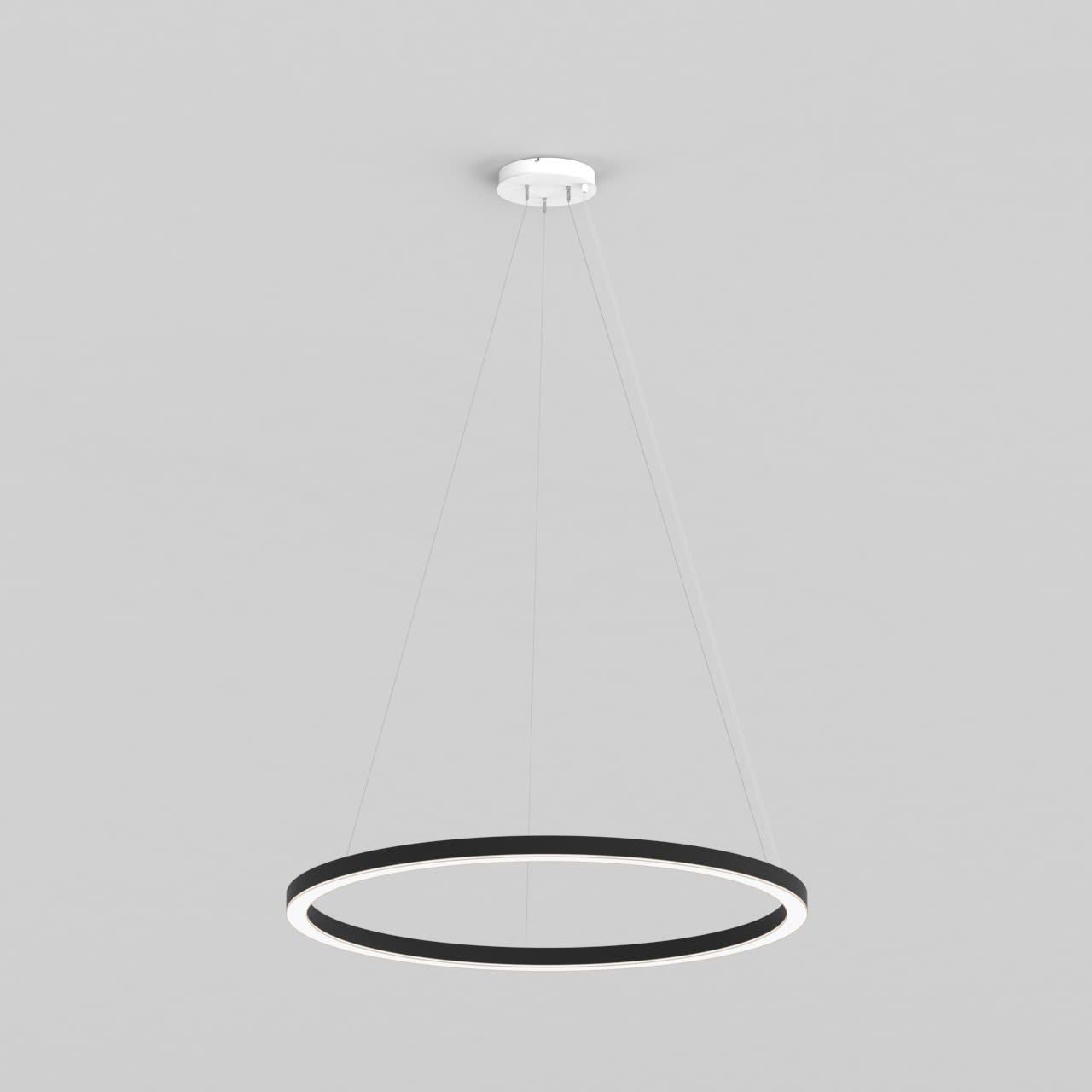Anneau lumineux LED de grande qualité avec boîtier de luminaire au design minimaliste, en tôle d’acier soudée sans soudure apparente avec surface thermolaquée en noir ’RAL9005’, structure fine mate, pour montage en suspension, pour éclairage direct. Installation par 3 filins de suspension 2000 mm avec fixation-tendeur rapide, avec réglage de la longueur. Raccordement électrique par 5 pôles utilisés et patère de plafond, 270x47 mm (DMxH). Positionnement de la patère au choix centré. La distance minimale entre 600 mm. Diffuseuren PMMA satiné pour un éclairage homogène, de 7 mm de haut pour la diffusion latérale. Luminaire équipé d’une technologie LED innovante avec une efficacité de 64 lm par W et une flux lumineux sortant de Convertisseur DALI pour gradation inclus, Nombre d''adresses DALI : 1, Evaluation de l''éblouissement selon la classification selon DIN EN 12464-1.2021-11 avec UGR < 22, Indice de rendu des couleurs (IRC) > 90, tolérance chromatique étroite MacAdam 3, Indice de protection IP20, classe de protection I, Groupe de risque RG = 0 selon norme IEC 62471, durée de vie nominale > 60.000 h [selon le décret de l’UE]. option de commutateur : C, Dimensions DMxH : 1360x055 mm, largeur de la section 54 mm. Poids : 18.0 kg