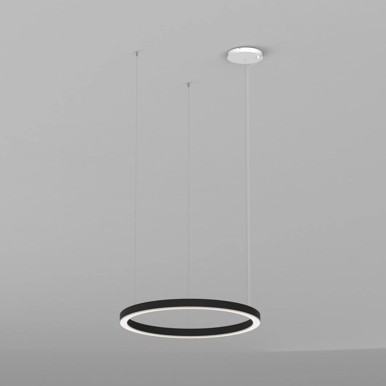 Anneau lumineux LED de grande qualité avec boîtier de luminaire au design minimaliste, en tôle d’acier soudée sans soudure apparente avec surface thermolaquée en noir ’RAL9005’, structure fine mate, pour montage en suspension, pour éclairage direct. Installation par 3 filins de suspension 1500 mm avec fixation-tendeur rapide et gabarit de forage, avec réglage de la longueur. Raccordement électrique par 5 pôles utilisés et patère de plafond, 270x40 mm (DMxH). Positionnement de la patère au choix, centré ou latéral. Diffuseuren PMMA satiné pour un éclairage homogène, de 7 mm de haut pour la diffusion latérale. Luminaire équipé d’une technologie LED innovante avec une efficacité de 57 lm par W et une flux lumineux sortant de Convertisseur DALI pour gradation inclus, Nombre d''adresses DALI : 1, Evaluation de l''éblouissement selon la classification selon DIN EN 12464-1.2021-11 avec UGR < 22, Indice de rendu des couleurs (IRC) > 90, tolérance chromatique étroite MacAdam 3, Indice de protection IP20, classe de protection I, Groupe de risque RG = 0 selon norme IEC 62471, durée de vie nominale > 60.000 h [selon le décret de l’UE]. option de commutateur : C, Dimensions DMxH : 1040x055 mm, largeur de la section 54 mm. Poids : 14.0 kg