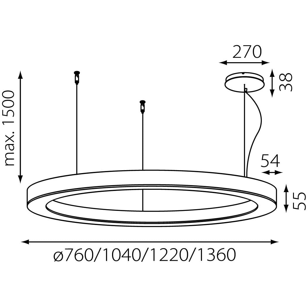 Anneau lumineux LED de grande qualité avec boîtier de luminaire au design minimaliste, en tôle d’acier soudée sans soudure apparente avec surface thermolaquée en noir ’RAL9005’, structure fine mate, pour montage en suspension, pour éclairage direct. Installation par 3 filins de suspension 1500 mm avec fixation-tendeur rapide et gabarit de forage, avec réglage de la longueur. Raccordement électrique par 5 pôles utilisés et patère de plafond, 270x40 mm (DMxH). Positionnement de la patère au choix, centré ou latéral. Diffuseuren PMMA satiné pour un éclairage homogène, de 7 mm de haut pour la diffusion latérale. Luminaire équipé d’une technologie LED innovante avec une efficacité de 63 lm par W et une flux lumineux sortant de Convertisseur DALI pour gradation inclus, Nombre d''adresses DALI : 1, Evaluation de l''éblouissement selon la classification selon DIN EN 12464-1.2021-11 avec UGR < 22, luminaire de poste de travail compatible écran selon DIN EN 12464-1 (luminosité à 65° <= 3000 cd/m²), Indice de rendu des couleurs (IRC) > 90, tolérance chromatique étroite MacAdam 3, Indice de protection IP20, classe de protection I, Groupe de risque RG = 0 selon norme IEC 62471, durée de vie nominale > 60.000 h [selon le décret de l’UE]. option de commutateur : C, Dimensions DMxH : 1360x055 mm, largeur de la section 54 mm. Poids : 18.0 kg