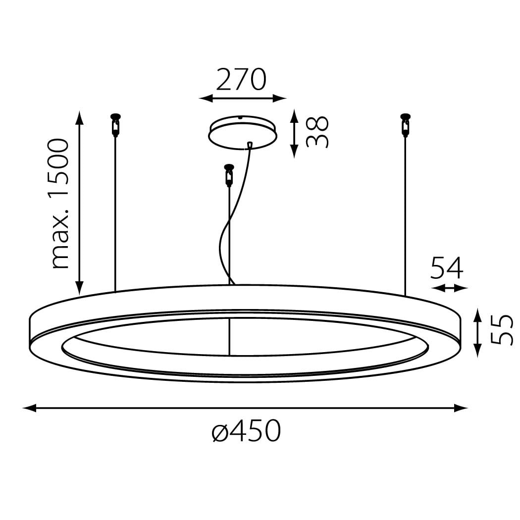 Anneau lumineux LED de grande qualité avec boîtier de luminaire au design minimaliste, en tôle d’acier soudée sans soudure apparente avec surface thermolaquée en noir ’RAL9005’, structure fine mate, pour montage en suspension, pour éclairage direct. Installation par 3 filins de suspension 1500 mm avec fixation-tendeur rapide et gabarit de forage, avec réglage de la longueur. Raccordement électrique par 3 pôles utilisés et patère de plafond, 270x40 mm (DMxH). Positionnement de la patère au choix, centré ou latéral. Diffuseuren PMMA satiné pour un éclairage homogène, de 7 mm de haut pour la diffusion latérale. Luminaire équipé d’une technologie LED innovante avec une efficacité de 52 lm par W et une flux lumineux sortant de Convertisseur inclus, Evaluation de l'éblouissement selon la classification selon DIN EN 12464-1.2021-11 avec UGR < 19, luminaire de poste de travail compatible écran selon DIN EN 12464-1 (luminosité à 65° <= 3000 cd/m²), Indice de rendu des couleurs (IRC) > 90, tolérance chromatique étroite MacAdam 3, Indice de protection IP20, classe de protection I, Groupe de risque RG = 0 selon norme IEC 62471, durée de vie nominale > 60.000 h [selon le décret de l’UE]. Option de commutateur : A, Dimensions DMxH : 0450x055 mm, largeur de la section 54 mm. Poids : 6,3 kg