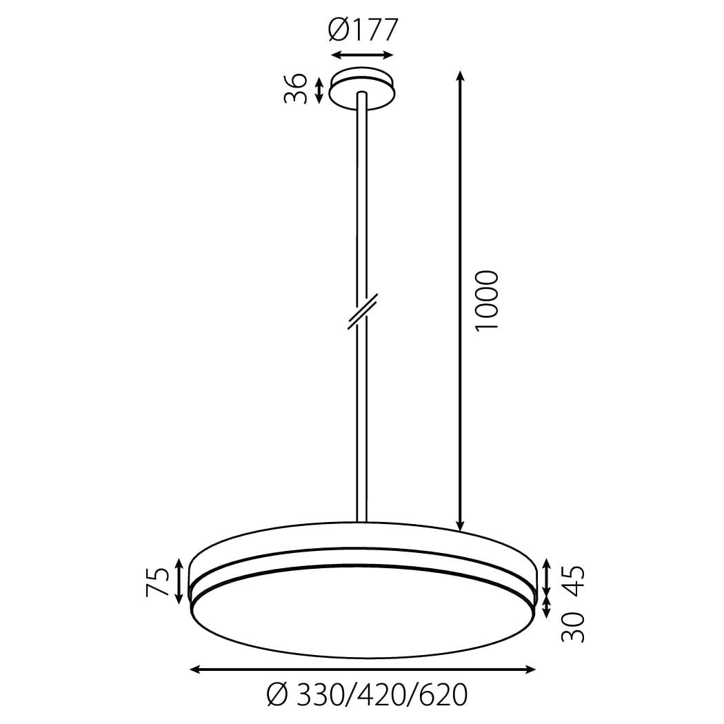 Luminaire LED de grande qualité avec boîtier de luminaire rond au design plat, en aluminium extrudé avec surface thermolaquée, en blanc ’RAL9016’, structure fine mate, pour montage en suspension rigideet pour éclairage direct. Installation par Suspension rigide 'Pende' d'un diamètre de 20 mm, d'une longueur de 1000 mm, en supplément de 2000 mm commandable, raccourcissable individuellement et avec alimentation transparente guidée intérieurement. 'Pende' en couleur de boîtier, revêtement en poudre en blanc RAL9016, patère de plafond en blanc avec 177x36 mm (d.xh) incl... Diffuseur direct en PMMA satiné pour un éclairage homogène. Raccordement électrique par 3 pôles utilisés, Luminaire équipé d’une technologie LED innovante avec une efficacité de 126 lm par W et une flux lumineux sortant de 5043 lm lm pour 40 W, en température de couleur 3000 K. Convertisseur DALI pour gradation dans un auvent en inclus, Evaluation de l'éblouissement selon la classification selon DIN EN 12464-1.2021-11 avec UGR < 25, ’Melanopic Ratio’ = (0,57), Indice de rendu des couleurs (IRC) > 90, tolérance chromatique étroite MacAdam 3, Groupe de risque RG0 selon norme IEC 62471, durée de vie nominale > 60.000 h [selon le décret de l’UE], classe énergétique (EEI). Indice de protection IP20, classe de protection I. Sur demande, également en version éclairage de secours avec batterie de 3h ou dans la version avec capteur de mouvement et de luminosité contrôlable/programmable, Casambi également sur demande. Des télécommandes sont disponibles comme accessoires. L'éclairage d'urgence et le capteur ne peuvent pas être combinés. Option de commutateur : C, source lumineuse remplaçable par un professionnel autorisé, dispositif de commande remplaçable par le fabricant, Dimensions DMxH : 0620x075 mm, hauteur totale du boîtier de 90 mm et hauteur visible de 75 mm, poids : 7,8 kg