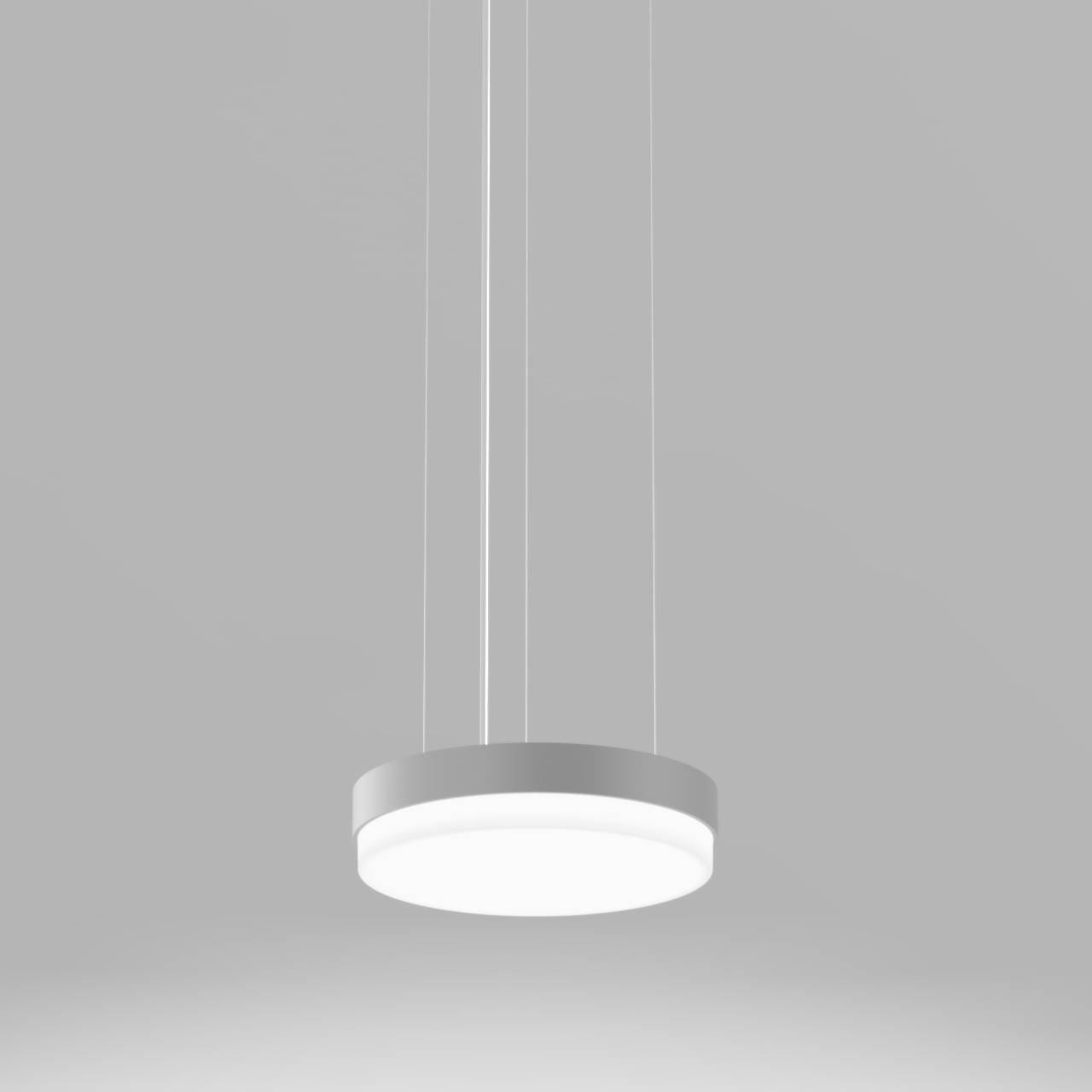 Luminaire LED de grande qualité avec boîtier de luminaire rond au design plat, en aluminium extrudé avec surface thermolaquée, en argent ’RAL9006’, structure fine mate, pour montage en suspension, et pour éclairage direct. Installation par 3 filins de suspension 1500 mm avec tendeurs rapides, avec réglage de la longueur. alimentation transparent 1750 mm avec patère blanche en saillie 100x36 mm (d.xh) incl.. Diffuseur direct en PMMA satiné pour un éclairage homogène. Raccordement électrique par 3 pôles utilisés, Luminaire équipé d’une technologie LED innovante avec une efficacité de 103 lm par W et une flux lumineux sortant de 1550 lm lm pour 15 W, en température de couleur 3000 K. Convertisseur DALI pour gradation dans un auvent en inclus, Evaluation de l'éblouissement selon la classification selon DIN EN 12464-1.2021-11 avec UGR < 25, ’Melanopic Ratio’ = (0,57), Indice de rendu des couleurs (IRC) > 90, tolérance chromatique étroite MacAdam 3, Groupe de risque RG0 selon norme IEC 62471, durée de vie nominale > 60.000 h [selon le décret de l’UE], classe énergétique (EEI). Indice de protection IP20, classe de protection I. Sur demande, également en version éclairage de secours avec batterie de 3h ou dans la version avec capteur de mouvement et de luminosité contrôlable/programmable, Casambi également sur demande. Des télécommandes sont disponibles comme accessoires. L'éclairage d'urgence et le capteur ne peuvent pas être combinés. Des câbles design de différentes longueurs et couleurs sont disponibles en option pour l’alimentation, Option de commutateur : C, source lumineuse remplaçable par un professionnel autorisé, dispositif de commande remplaçable par le fabricant, Dimensions DMxH : 0330x075 mm, hauteur totale du boîtier de 90 mm et hauteur visible de 75 mm, poids : 2,6 kg