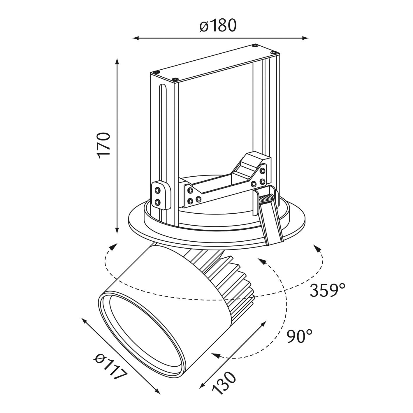 Projecteur encastré Led en aluminium moulé sous pression thermolaqué en revêtu par poudre blanc RAL9016, structure fine mate, en température de couleur 3000 K. Led technologie innovante avec un flux lumineux sortant de 3965 lm pour 32 W. Réflecteur à facettes en aluminium, avec verre de protection. Caractéristique de rayonnement : un faisceau ’spot’ en 15°. Remplacement du réflecteur sans outil grâce à la fermeture à baïonnette. Projecteur orientable sur 359°, tête de projecteur pivotante sur 90° et extractible. Refroidissement passif par dissipateur en profilé d’aluminium extrudé. Projecteur complet incluant réflecteur et convertisseur inclus. Indice de rendu des couleurs (IRC) > 90, Evaluation de l'éblouissement selon la classification selon DIN EN 12464-1.2021-11 avec UGR < 22, indice de rendu des couleurs (IRC) > 90, indice de protection IP20, classe de protection I, durée de vie nominale > 60.000 h [selon le décret de l’UE]. source lumineuse remplaçable par un professionnel autorisé, dispositif de commande remplaçable par un professionnel autorisé, En option : Grille nid d´abeille. Dimensions : DM : 0180 mm, Découpe DMxH : 170x180 mm, Poids : 1,3 kg