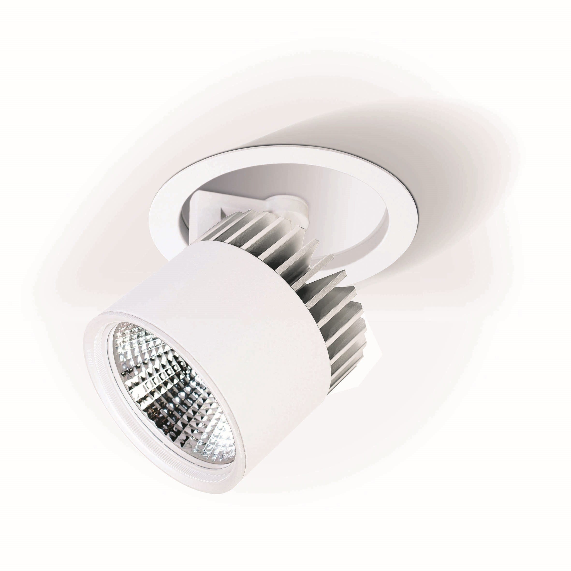 Projecteur encastré Led en aluminium moulé sous pression thermolaqué en revêtu par poudre blanc RAL9016, structure fine mate, en température de couleur 4000 K. Led technologie innovante avec un flux lumineux sortant de 4099 lm pour 31 W. Réflecteur à facettes en aluminium, avec verre de protection. Caractéristique de rayonnement : un faisceau ’medium’ en 26°. Remplacement du réflecteur sans outil grâce à la fermeture à baïonnette. Projecteur orientable sur 359°, tête de projecteur pivotante sur 90° et extractible. Refroidissement passif par dissipateur en profilé d’aluminium extrudé. Projecteur complet incluant réflecteur et convertisseur inclus. Indice de rendu des couleurs (IRC) > 80, Evaluation de l'éblouissement selon la classification selon DIN EN 12464-1.2021-11 avec UGR < 22, indice de rendu des couleurs (IRC) > 80, indice de protection IP20, classe de protection I, durée de vie nominale > 60.000 h [selon le décret de l’UE]. source lumineuse remplaçable par un professionnel autorisé, dispositif de commande remplaçable par un professionnel autorisé, En option : Grille nid d´abeille. Dimensions : DM : 0180 mm, Découpe DMxH : 170x180 mm, Poids : 1,3 kg