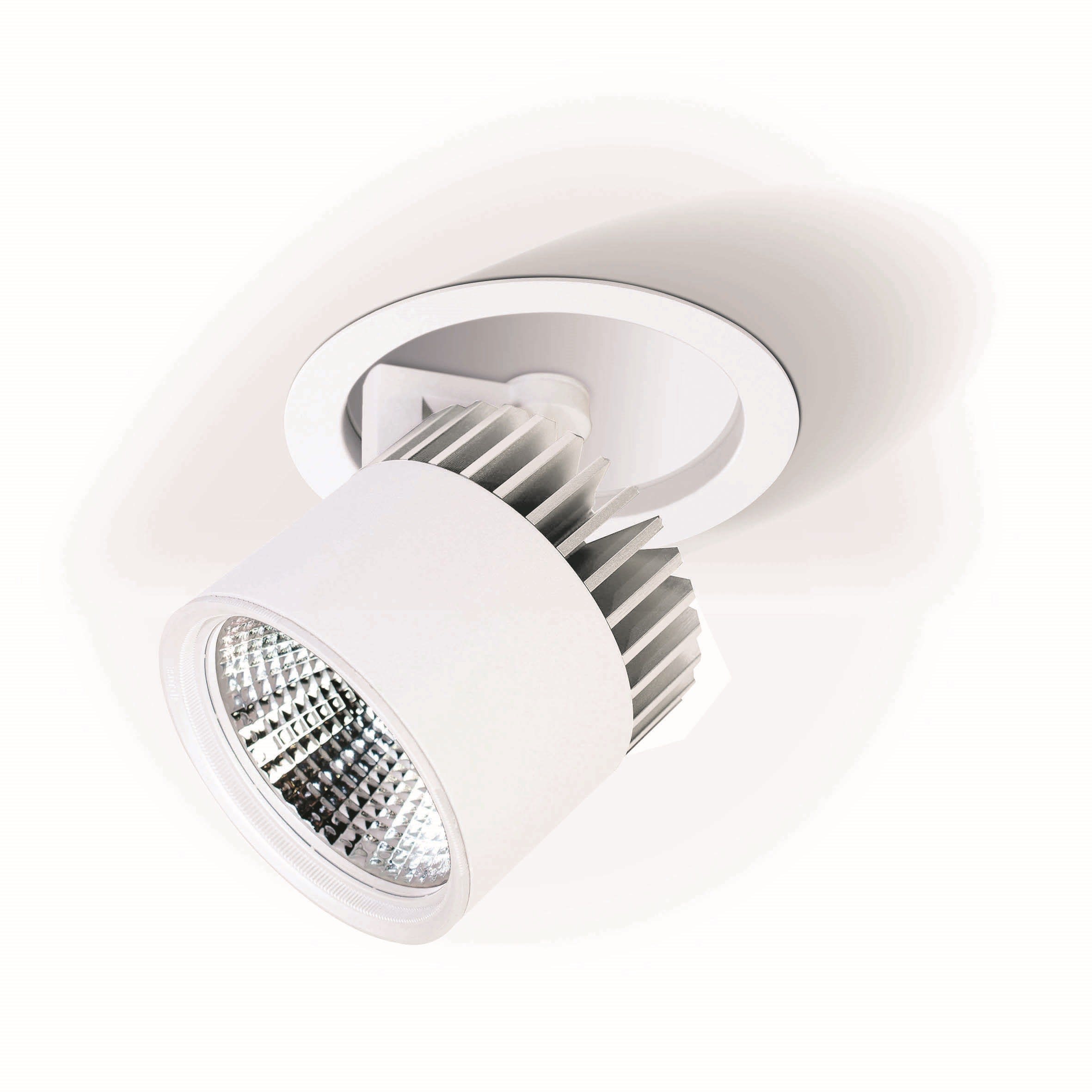 Projecteur encastré Led en aluminium moulé sous pression thermolaqué en revêtu par poudre blanc RAL9016, structure fine mate,pour l’éclairage d’espaces de vente et d’exposition. Module Led spécial pour un charcuterie éclairement optimal. Led technologie innovante avec un flux lumineux sortant de 1947 lm pour 31 W. Réflecteur à facettes en aluminium, avec verre de protection. Caractéristique de rayonnement : un faisceau ’medium’ en 26°. Remplacement du réflecteur sans outil grâce à la fermeture à baïonnette. Projecteur orientable sur 359°, tête de projecteur pivotante sur 90° et extractible. Refroidissement passif par dissipateur en profilé d’aluminium extrudé. Projecteur complet incluant réflecteur et convertisseur inclus. Indice de rendu des couleurs (IRC) > 80, Evaluation de l'éblouissement selon la classification selon DIN EN 12464-1.2021-11 avec UGR < 19, indice de rendu des couleurs (IRC) > 80, indice de protection IP20, classe de protection I, durée de vie nominale > 60.000 h [selon le décret de l’UE]. source lumineuse remplaçable par un professionnel autorisé, dispositif de commande remplaçable par un professionnel autorisé, En option : Grille nid d´abeille. Dimensions : DM : 0180 mm, Découpe DMxH : 170x180 mm, Poids : 1,3 kg