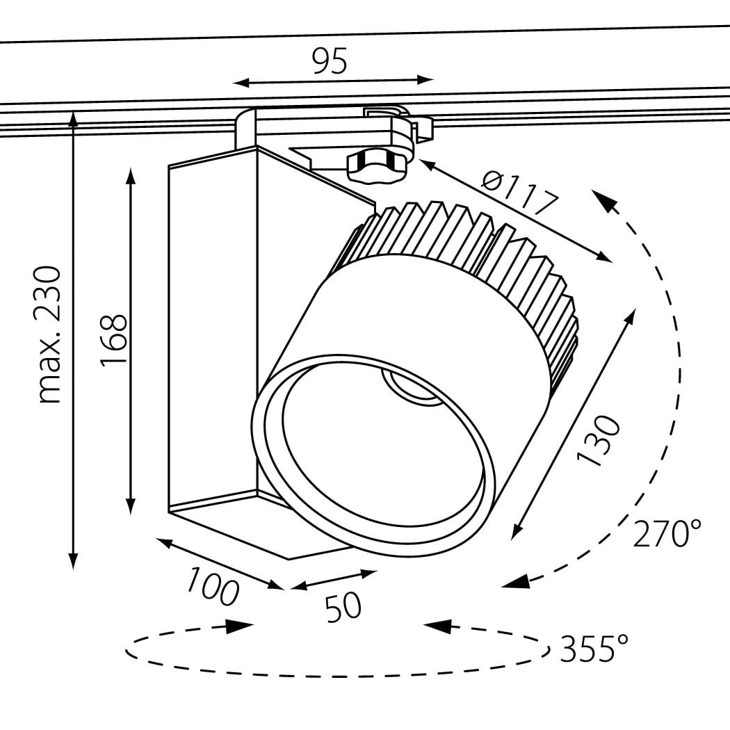 Projecteur LED pour montage apparent sur rail 3 phases, en aluminium moulé sous pression thermolaqué en revêtu par poudre RAL9016 blanc fine matte, structure fine mate, optimisé pour l’éclairage d’espaces de vente et d’exposition. Module Led spécial pour un charcuterie éclairement optimal. Led technologie innovante avec un flux lumineux sortant de 2474 lm pour 41 W, en température de couleur K. Réflecteur en aluminium à facettes ou lamelles longitudinales. Caractéristique de 26. Tête de réflecteur pivotante sur 270°. Remplacement du réflecteur sans outil grâce à la fermeture à baïonnette. Tête de projecteur en aluminium, séparée thermiquement et orientable sur 355°. Refroidissement passif à l’aide d'un radiateur en profilé d’aluminium extrudé anodisé. Projecteur complet incluant réflecteur et avec adaptateur universel 3 Phases blanc. Non adapté au montage mural. Convertisseur inclus. Indice de rendu des couleurs (IRC) > 80, durée de vie nominale > 60.000 h [selon le décret de l’UE], groupe de risque RG selon norme IEC 62471. Indice de protection IP20, classe de protection I. En option : Grille nid d´abeille. Dimensions : LxlxH : 119x117x226 mmDMxH : 0172x226 mm, Poids : 1,4 kg