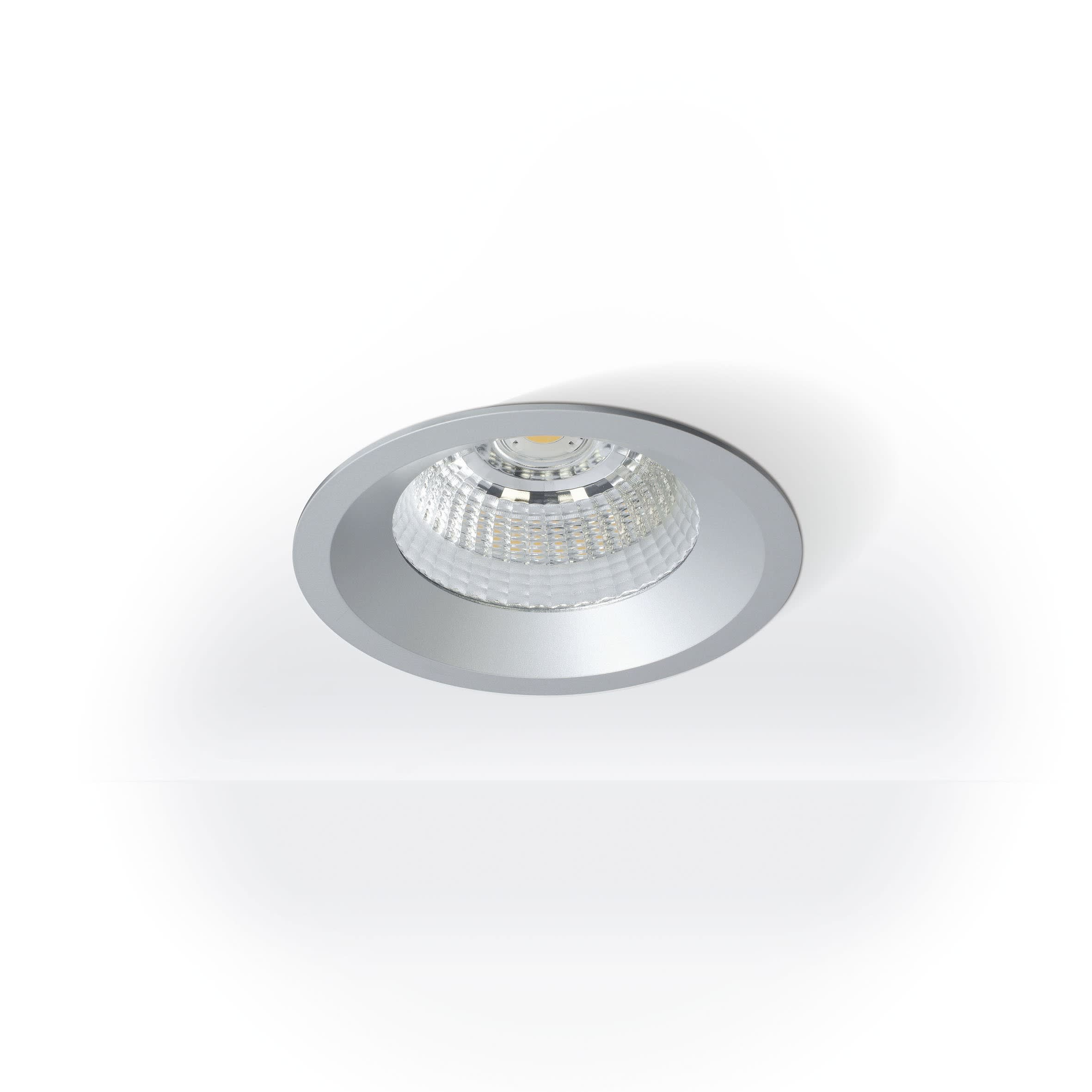 Projecteur encastré fixe LED en aluminium moulé sous pression thermolaqué en revêtu par poudre argent fine matte. LED technologie innovante avec un flux lumineux sortant de 1885 lm pour 19.5 W, en température de couleur 2700 K. Réflecteur à facettes en aluminium, avec verre de protection. Système optique en retrait pour optimiser l’anti-éblouissement. Caractéristique de rayonnement : un faisceau ’wide flood’ en 60°. Projecteur complet incluant réflecteur et convertisseur inclus. Indice de rendu des couleurs (IRC) > 90, Évaluation intégrée de l’éblouissement (UGR) < 19. Durée de vie nominale > 60.000 h [selon le décret de l’UE]. Indice de protection IP44, classe de protection I, Le bouclage sur demande, source lumineuse remplaçable par le fabricant, dispositif de commande remplaçable par un professionnel autorisé, Dimensions : DMxH : 138x105 mm, Découpe DMxH : 125x120 mm, Poids : 0,8 kg