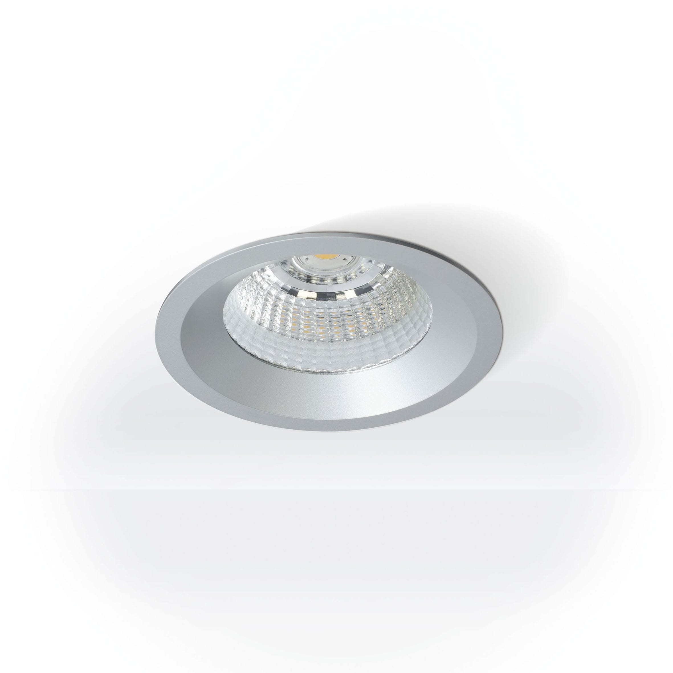 Projecteur encastré fixe LED en aluminium moulé sous pression thermolaqué en revêtu par poudre argent fine matte. LED technologie innovante avec un flux lumineux sortant de 3810 lm pour 31 W, en température de couleur 3000 K. Réflecteur à facettes en aluminium, avec verre de protection. Système optique en retrait pour optimiser l’anti-éblouissement. Caractéristique de rayonnement : un faisceau ’spot’ en 20°. Projecteur complet incluant réflecteur et convertisseur inclus. Indice de rendu des couleurs (IRC) > 90, Évaluation intégrée de l’éblouissement (UGR) < 16. Durée de vie nominale > 60.000 h [selon le décret de l’UE]. Indice de protection IP44, classe de protection I, Le bouclage sur demande, source lumineuse remplaçable par le fabricant, dispositif de commande remplaçable par un professionnel autorisé, Dimensions : DMxH : 165x135 mm, Découpe DMxH : 150x150 mm, Poids : 1,1 kg