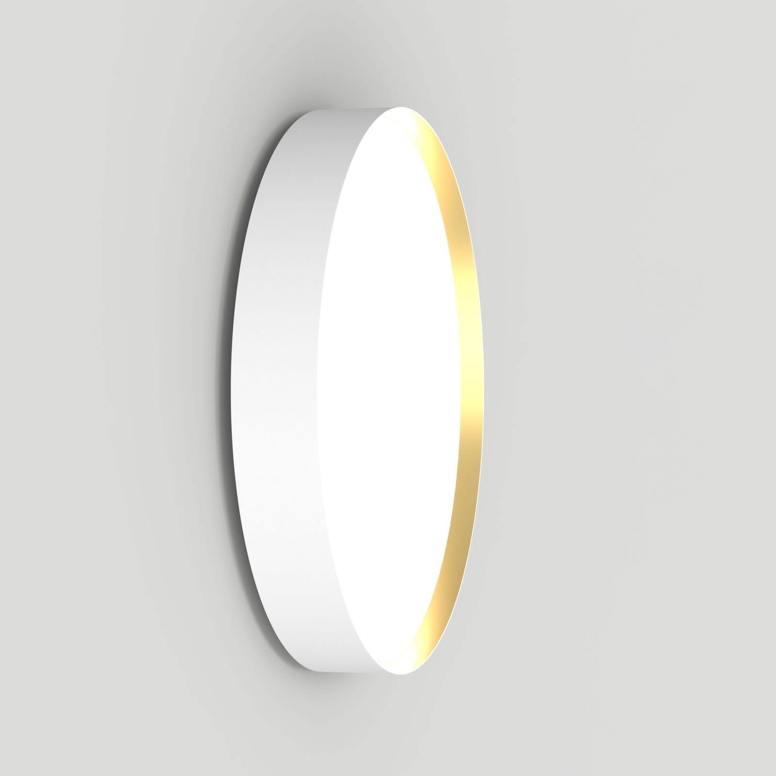 Luminaire LED de grande qualité avec boîtier de luminaire rondé au design plat en aluminium extrudé avec surface thermolaquée avec boîtier en revêtu par poudre RAL9016 blanc fine matte et anneau décoratif 'glaring gold' pour montage mural avec émission indirecte de la lumière (aura). Installation par fixation murale incl.. Diffuseurs direct et indirect en polycarbonate satiné pour un éclairage homogène. Raccordement électrique par 5 pôles utilisés, Luminaire équipé d’une technologie LED innovante avec une efficacité de 125 lm par W et une flux lumineux sortant de 6362 lm lm pour 51 W, en température de couleur 4000 K. Nombre d'adresses DALI : 2. Convertisseur DALI pour gradation, Evaluation de l'éblouissement selon la classification selon DIN EN 12464-1.2021-11 avec UGR < 22, ’Melanopic Ratio’ = (0,739), Indice de rendu des couleurs (IRC) > 90, tolérance chromatique étroite MacAdam 3, Groupe de risque RG0 selon norme IEC 62471, durée de vie nominale > 60.000 h [selon le décret de l’UE], classe énergétique (EEI). Indice de protection IP50, résistance aux chocs IK07 selon norme IEC 62262:2012, classe de protection I. Sur demande, également en version éclairage de secours avec batterie de 3h ou dans la version avec capteur de mouvement et de luminosité contrôlable/programmable, Casambi également sur demande. Des télécommandes sont disponibles comme accessoires. L’éclairage d’urgence et le capteur ne peuvent pas être combinés. Option de commutateur : C, source lumineuse remplaçable par le fabricant, dispositif de commande remplaçable par un professionnel autorisé, Dimensions DMxH : 0620x091 mm, hauteur totale du boîtier de 110 mm, déport du mur (profondeur) = 19 mm, poids : 5,5 kg