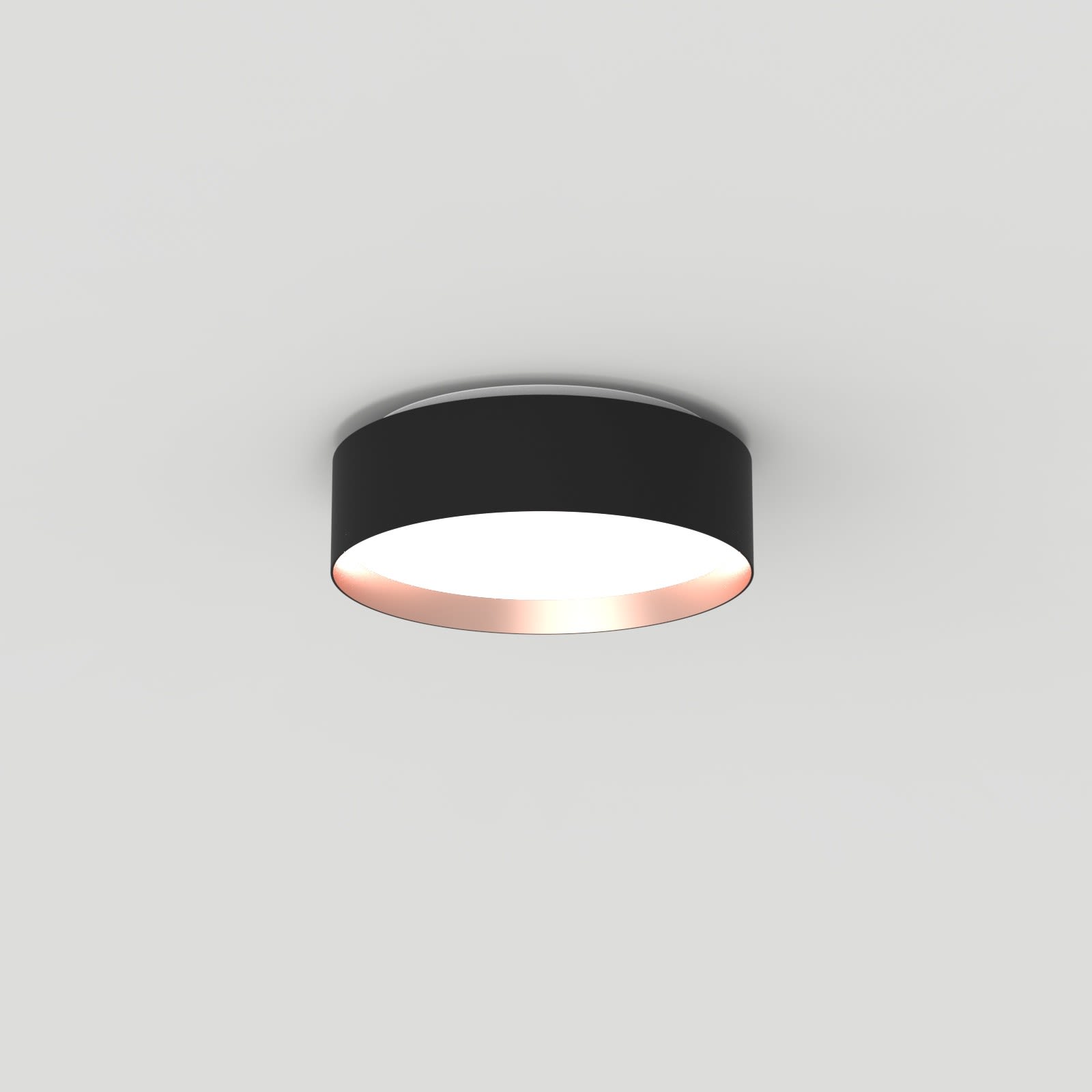 Luminaire LED de grande qualité avec boîtier de luminaire rondé au design plat en aluminium extrudé avec surface thermolaquée avec boîtier en revêtu par poudre RAL9005 noir fine matte et anneau décoratif 'capital copper' pour montage en saillie. Installation par le matériel de montage fourni sur CLICK&PLAY-canopée.. Diffuseur en PMMA microprismatique pour une luminance réduite (LRA). Raccordement électrique par 5 pôles utilisés, Luminaire équipé d’une technologie LED innovante avec une efficacité de 71 lm par W et une flux lumineux sortant de 1069 lm lm pour 15 W, en température de couleur 3000 K. Nombre d'adresses DALI : 1. Convertisseur DALI pour gradation, Evaluation de l'éblouissement selon la classification selon DIN EN 12464-1.2021-11 avec UGR < 19, luminaire de poste de travail compatible écran selon DIN EN 12464-1 (luminosité à 65° <= 3000 cd/m²), ’Melanopic Ratio’ = (0,57), Indice de rendu des couleurs (IRC) > 90, tolérance chromatique étroite MacAdam 3, Groupe de risque RG0 selon norme IEC 62471, durée de vie nominale > 60.000 h [selon le décret de l’UE], classe énergétique (EEI). Indice de protection IP50, résistance aux chocs IK07 selon norme IEC 62262:2012, classe de protection I. Sur demande, également en version éclairage de secours avec batterie de 3h ou dans la version avec capteur de mouvement et de luminosité contrôlable/programmable, Casambi également sur demande. Des télécommandes sont disponibles comme accessoires. L’éclairage d’urgence et le capteur ne peuvent pas être combinés. Option de commutateur : C, source lumineuse remplaçable par le fabricant, dispositif de commande remplaçable par un professionnel autorisé, Dimensions DMxH : 0330x091 mm, hauteur totale du boîtier de 110 mm, joint creux de 19 mm, poids : 2,3 kg