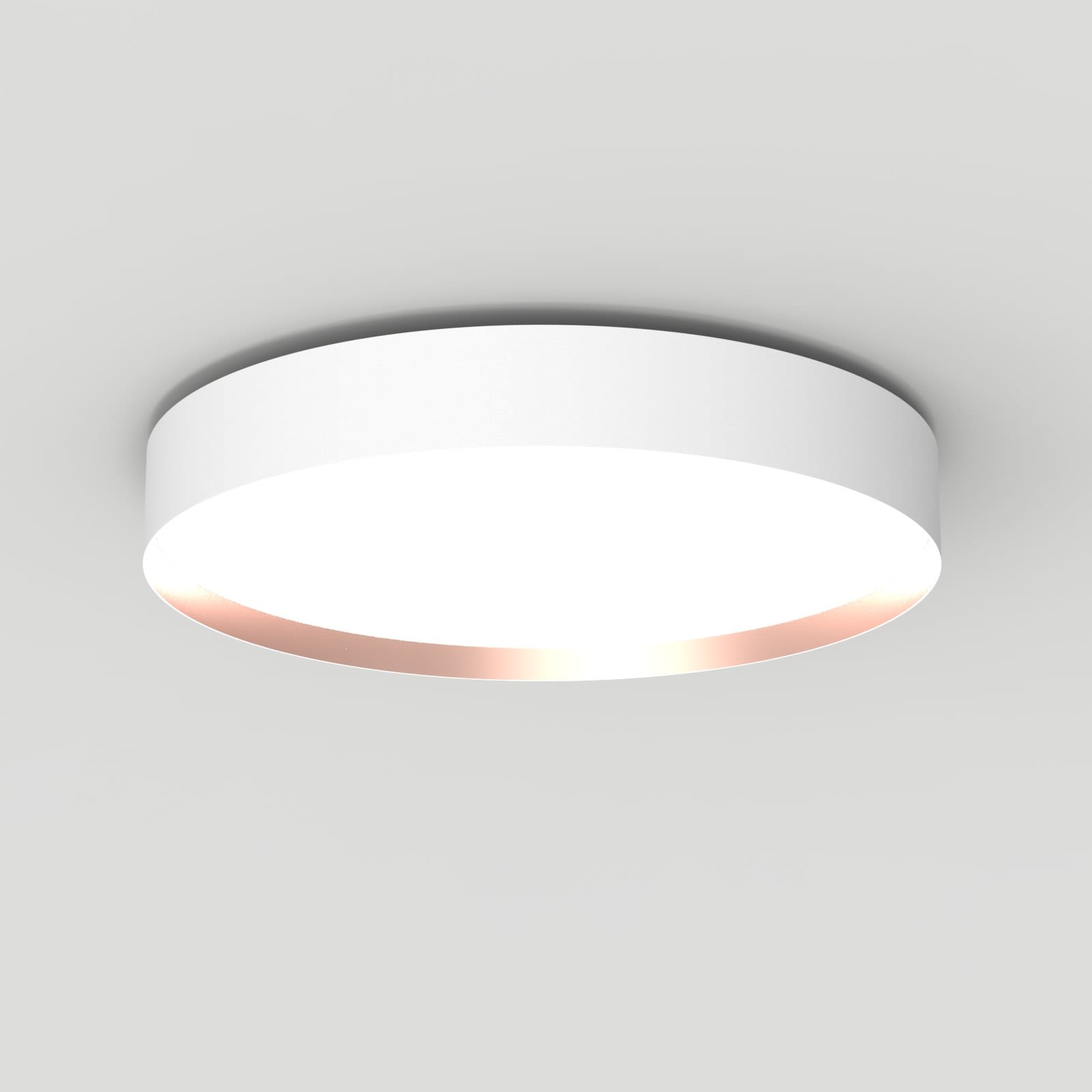 Luminaire LED de grande qualité avec boîtier de luminaire rondé au design plat en aluminium extrudé avec surface thermolaquée avec boîtier en revêtu par poudre RAL9016 blanc fine matte et anneau décoratif 'capital copper' pour montage en saillie avec émission indirecte de la lumière (aura). Installation par le matériel de montage fourni sur CLICK&PLAY-canopée.. Diffuseur direct en polycarbonate microprismatique pour une luminance réduite (LRA), indirect en PMMA satiné. Raccordement électrique par 5 pôles utilisés, Luminaire équipé d’une technologie LED innovante avec une efficacité de 107 lm par W et une flux lumineux sortant de 5445 lm lm pour 51 W, en température de couleur 3000 K. Nombre d'adresses DALI : 1. Convertisseur DALI pour gradation, Evaluation de l'éblouissement selon la classification selon DIN EN 12464-1.2021-11 avec UGR < 19, ’Melanopic Ratio’ = (0,57), Indice de rendu des couleurs (IRC) > 90, tolérance chromatique étroite MacAdam 3, Groupe de risque RG0 selon norme IEC 62471, durée de vie nominale > 60.000 h [selon le décret de l’UE], classe énergétique (EEI). Indice de protection IP50, résistance aux chocs IK07 selon norme IEC 62262:2012, classe de protection I. Sur demande, également en version éclairage de secours avec batterie de 3h ou dans la version avec capteur de mouvement et de luminosité contrôlable/programmable, Casambi également sur demande. Des télécommandes sont disponibles comme accessoires. L’éclairage d’urgence et le capteur ne peuvent pas être combinés. Option de commutateur : C, source lumineuse remplaçable par le fabricant, dispositif de commande remplaçable par un professionnel autorisé, Dimensions DMxH : 0620x091 mm, hauteur totale du boîtier de 110 mm, joint creux de 19 mm, poids : 5,5 kg