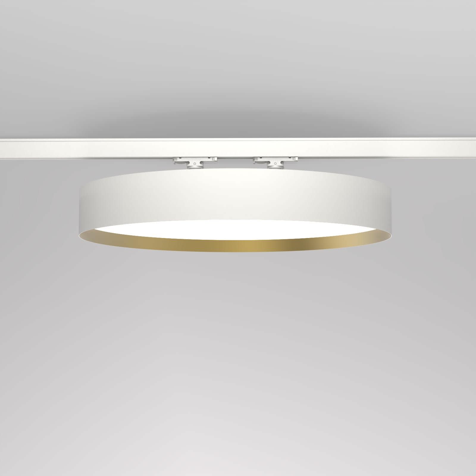 Luminaire LED de grande qualité avec boîtier de luminaire rondé au design plat en aluminium extrudé avec surface thermolaquée avec boîtier en revêtu par poudre RAL9016 blanc fine matte et anneau décoratif 'glaring gold' pour le montage sur un rail triphasé avec émission indirecte de la lumière (aura). Installation par 2 x adaptateur DALI Stucchi ONEtrack/Global pulse blanc et sur CLICK&PLAY-canopée. Diffuseur direct en polycarbonate microprismatique pour une luminance réduite (LRA), indirect en PMMA satiné. Luminaire équipé d’une technologie LED innovante avec une efficacité de 116 lm par W et une flux lumineux sortant de 5934 lm lm pour 51 W, en température de couleur 4000 K. Nombre d'adresses DALI : 1. Convertisseur DALI pour gradation, Evaluation de l'éblouissement selon la classification selon DIN EN 12464-1.2021-11 avec UGR < 22, ’Melanopic Ratio’ = (0,739), Indice de rendu des couleurs (IRC) > 90, tolérance chromatique étroite MacAdam 3, Groupe de risque RG0 selon norme IEC 62471, durée de vie nominale > 60.000 h [selon le décret de l’UE], classe énergétique (EEI). Indice de protection IP50, classe de protection I. Sur demande, également en version éclairage de secours avec batterie de 3h ou dans la version avec capteur de mouvement et de luminosité contrôlable/programmable, Casambi également sur demande. Des télécommandes sont disponibles comme accessoires. L’éclairage d’urgence et le capteur ne peuvent pas être combinés. Option de commutateur : C, source lumineuse remplaçable par le fabricant, dispositif de commande remplaçable par un professionnel autorisé, Dimensions DMxH : 0620x091 mm, hauteur totale du boîtier de 110 mm, hauteur du baldaquin 19, hauteur visible 91 mm, hauteur de l'anneau décoratif 26 mm, hauteur des adaptateurs de rails 48 mm, poids : 5,8 kg