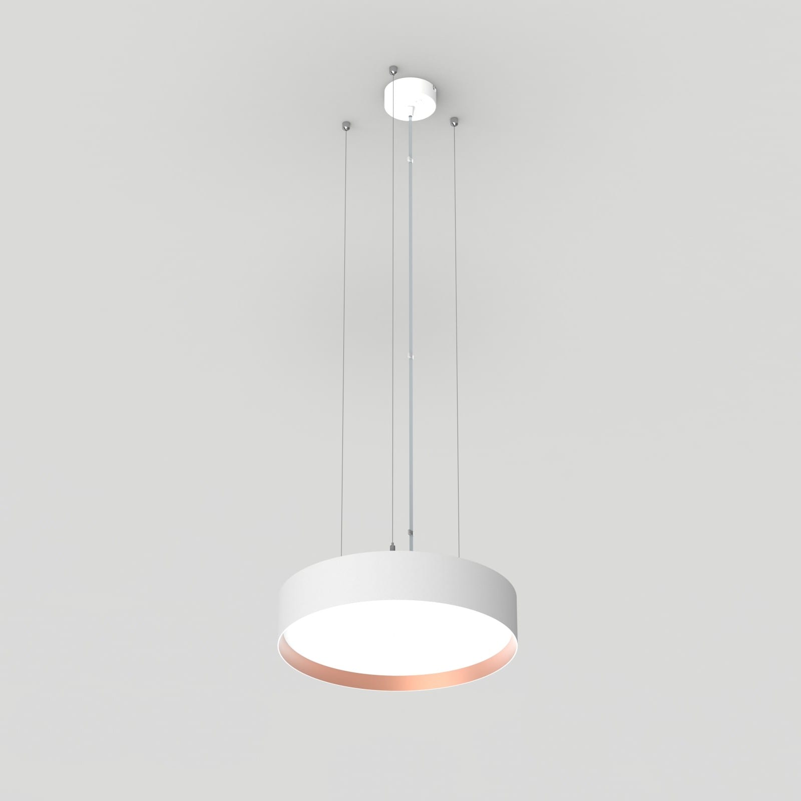 Luminaire LED de grande qualité avec boîtier de luminaire rondé au design plat en aluminium extrudé avec surface thermolaquée avec boîtier en revêtu par poudre RAL9016 blanc fine matte et anneau décoratif 'capital copper' pour montage en suspension. Installation par 3 filins de suspension 1500 mm avec tendeurs rapides, avec réglage de la longueur. alimentation transparent 1750 mm avec patère blanche en saillie 100x36 mm (d.xh) incl.. Diffuseur en PMMA microprismatique pour une luminance réduite (LRA). Raccordement électrique par 5 pôles utilisés, Luminaire équipé d’une technologie LED innovante avec une efficacité de 86 lm par W et une flux lumineux sortant de 2419 lm lm pour 28 W, en température de couleur 3000 K. Nombre d'adresses DALI : 1. Convertisseur DALI pour gradation, Evaluation de l'éblouissement selon la classification selon DIN EN 12464-1.2021-11 avec UGR < 22, ’Melanopic Ratio’ = (0,57), Indice de rendu des couleurs (IRC) > 90, tolérance chromatique étroite MacAdam 3, Groupe de risque RG0 selon norme IEC 62471, durée de vie nominale > 60.000 h [selon le décret de l’UE], classe énergétique (EEI). Indice de protection IP50, classe de protection I. Sur demande, également en version éclairage de secours avec batterie de 3h ou dans la version avec capteur de mouvement et de luminosité contrôlable/programmable, Casambi également sur demande. Des télécommandes sont disponibles comme accessoires. L’éclairage d’urgence et le capteur ne peuvent pas être combinés. Des câbles design de différentes longueurs et couleurs sont disponibles en option pour l’alimentation, Option de commutateur : C, source lumineuse remplaçable par le fabricant, dispositif de commande remplaçable par un professionnel autorisé, Dimensions DMxH : 0420x091 mm, hauteur totale du boîtier de 110 mm et hauteur visible de 91 mm, poids : 3,4 kg