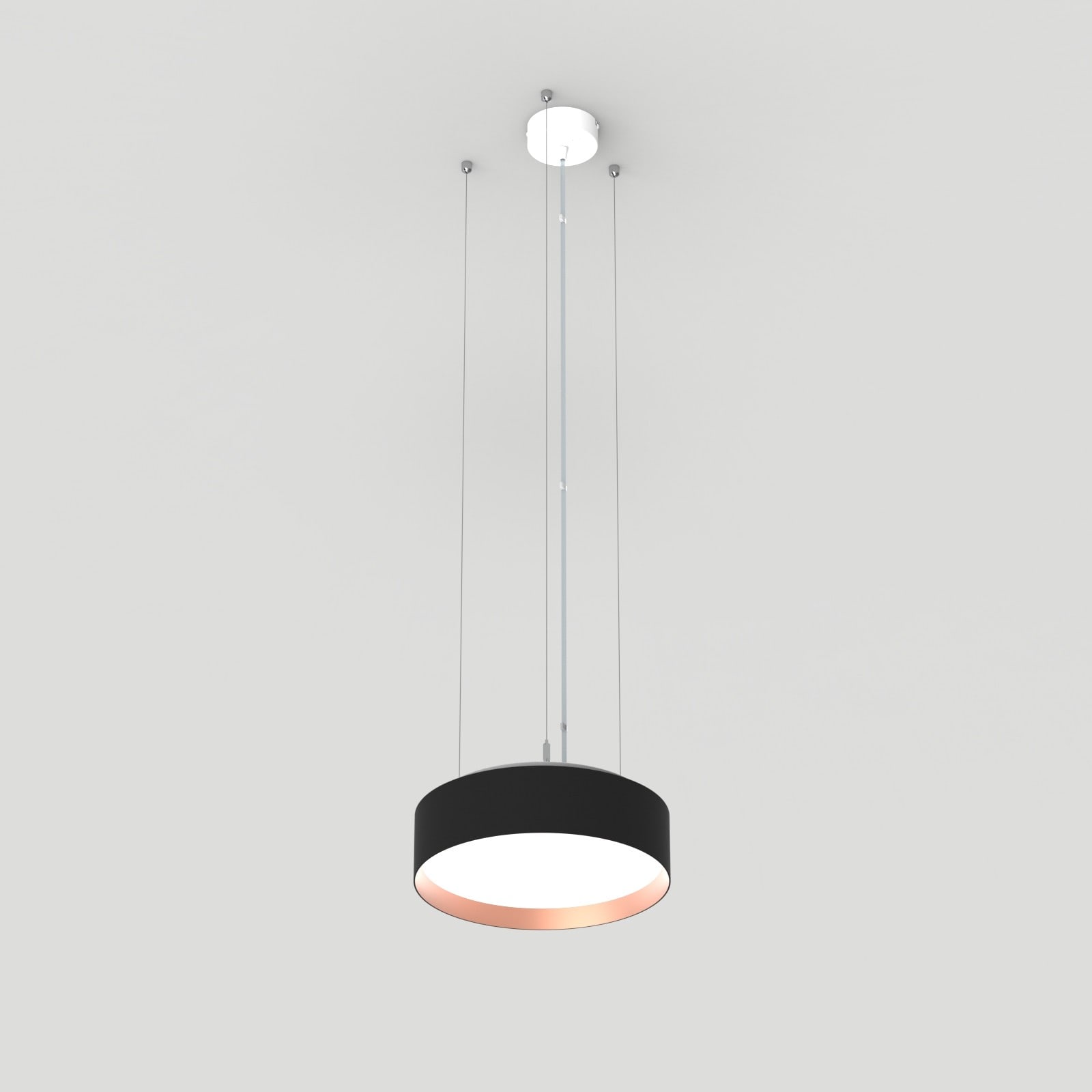 Luminaire LED de grande qualité avec boîtier de luminaire rondé au design plat en aluminium extrudé avec surface thermolaquée avec boîtier en revêtu par poudre RAL9005 noir fine matte et anneau décoratif 'capital copper' pour montage en suspension avec émission indirecte de la lumière. Installation par 3 filins de suspension 1500 mm avec tendeurs rapides, avec réglage de la longueur. alimentation transparent 1750 mm avec patère blanche en saillie 100x36 mm (d.xh) incl.. Diffuseurs direct et indirect en polycarbonate satiné pour un éclairage homogène. Raccordement électrique par 5 pôles utilisés, Luminaire équipé d’une technologie LED innovante avec une efficacité de 80 lm par W et une flux lumineux sortant de 2244 lm lm pour 28 W, en température de couleur 4000 K. Nombre d'adresses DALI : 1. Convertisseur DALI pour gradation, Evaluation de l'éblouissement selon la classification selon DIN EN 12464-1.2021-11 avec UGR < 22, ’Melanopic Ratio’ = (0,739), Indice de rendu des couleurs (IRC) > 90, tolérance chromatique étroite MacAdam 3, Groupe de risque RG0 selon norme IEC 62471, durée de vie nominale > 60.000 h [selon le décret de l’UE], classe énergétique (EEI). Indice de protection IP50, classe de protection I. Sur demande, également en version éclairage de secours avec batterie de 3h ou dans la version avec capteur de mouvement et de luminosité contrôlable/programmable, Casambi également sur demande. Des télécommandes sont disponibles comme accessoires. L’éclairage d’urgence et le capteur ne peuvent pas être combinés. Des câbles design de différentes longueurs et couleurs sont disponibles en option pour l’alimentation, Option de commutateur : C, source lumineuse remplaçable par le fabricant, dispositif de commande remplaçable par un professionnel autorisé, Dimensions DMxH : 0330x091 mm, hauteur totale du boîtier de 110 mm et hauteur visible de 91 mm, poids : 2,8 kg
