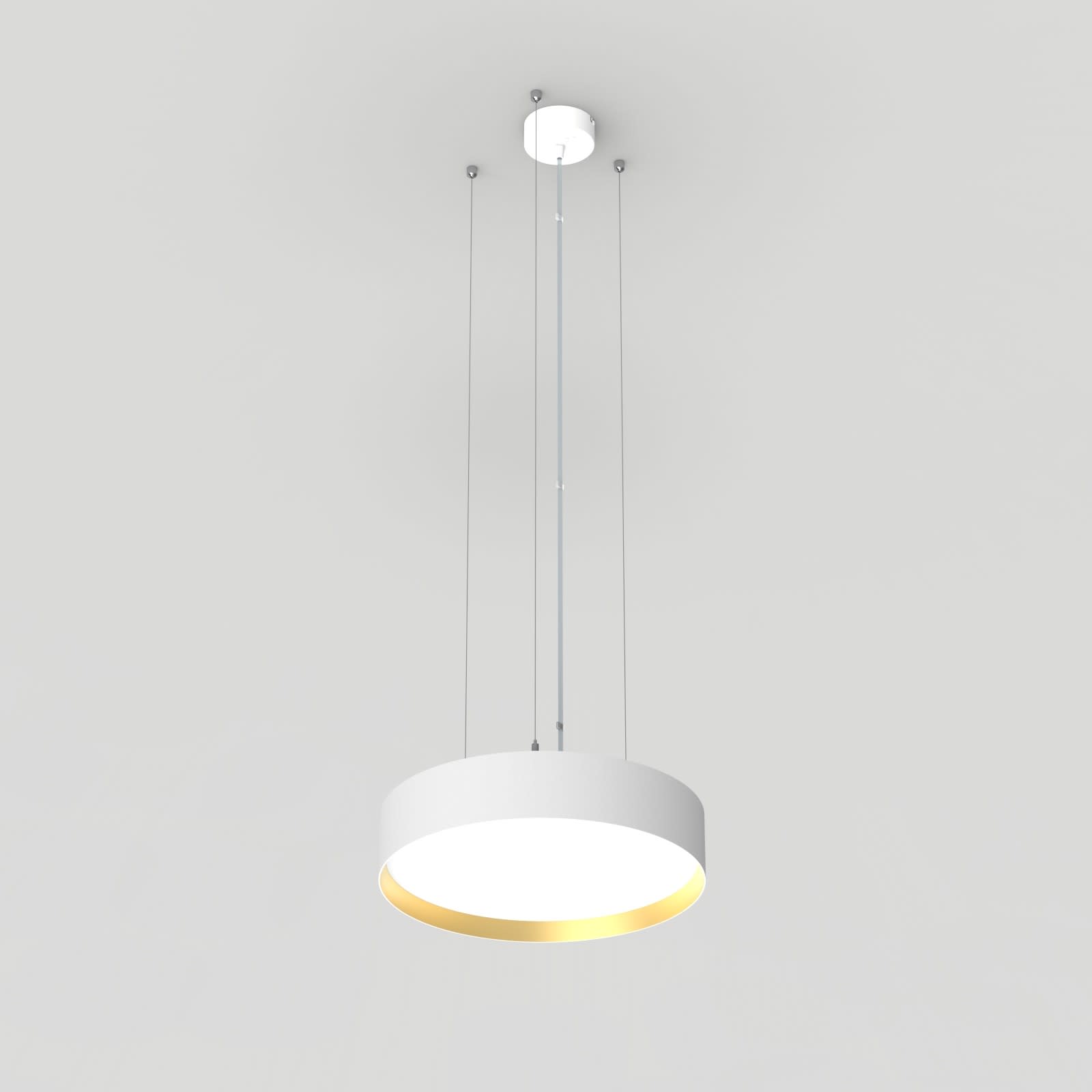 Luminaire LED de grande qualité avec boîtier de luminaire rondé au design plat en aluminium extrudé avec surface thermolaquée avec boîtier en revêtu par poudre RAL9016 blanc fine matte et anneau décoratif 'glaring gold' pour montage en suspension avec émission indirecte de la lumière. Installation par 3 filins de suspension 1500 mm avec tendeurs rapides, avec réglage de la longueur. alimentation transparent 1750 mm avec patère blanche en saillie 100x36 mm (d.xh) incl.. Diffuseurs direct et indirect en polycarbonate satiné pour un éclairage homogène. Raccordement électrique par 5 pôles utilisés, Luminaire équipé d’une technologie LED innovante avec une efficacité de 116 lm par W et une flux lumineux sortant de 4764 lm lm pour 41 W, en température de couleur 4000 K. Nombre d'adresses DALI : 1. Convertisseur DALI pour gradation, Evaluation de l'éblouissement selon la classification selon DIN EN 12464-1.2021-11 avec UGR < 22, ’Melanopic Ratio’ = (0,739), Indice de rendu des couleurs (IRC) > 90, tolérance chromatique étroite MacAdam 3, Groupe de risque RG0 selon norme IEC 62471, durée de vie nominale > 60.000 h [selon le décret de l’UE], classe énergétique (EEI). Indice de protection IP50, classe de protection I. Sur demande, également en version éclairage de secours avec batterie de 3h ou dans la version avec capteur de mouvement et de luminosité contrôlable/programmable, Casambi également sur demande. Des télécommandes sont disponibles comme accessoires. L’éclairage d’urgence et le capteur ne peuvent pas être combinés. Des câbles design de différentes longueurs et couleurs sont disponibles en option pour l’alimentation, Option de commutateur : C, source lumineuse remplaçable par le fabricant, dispositif de commande remplaçable par un professionnel autorisé, Dimensions DMxH : 0420x091 mm, hauteur totale du boîtier de 110 mm et hauteur visible de 91 mm, poids : 3,7 kg