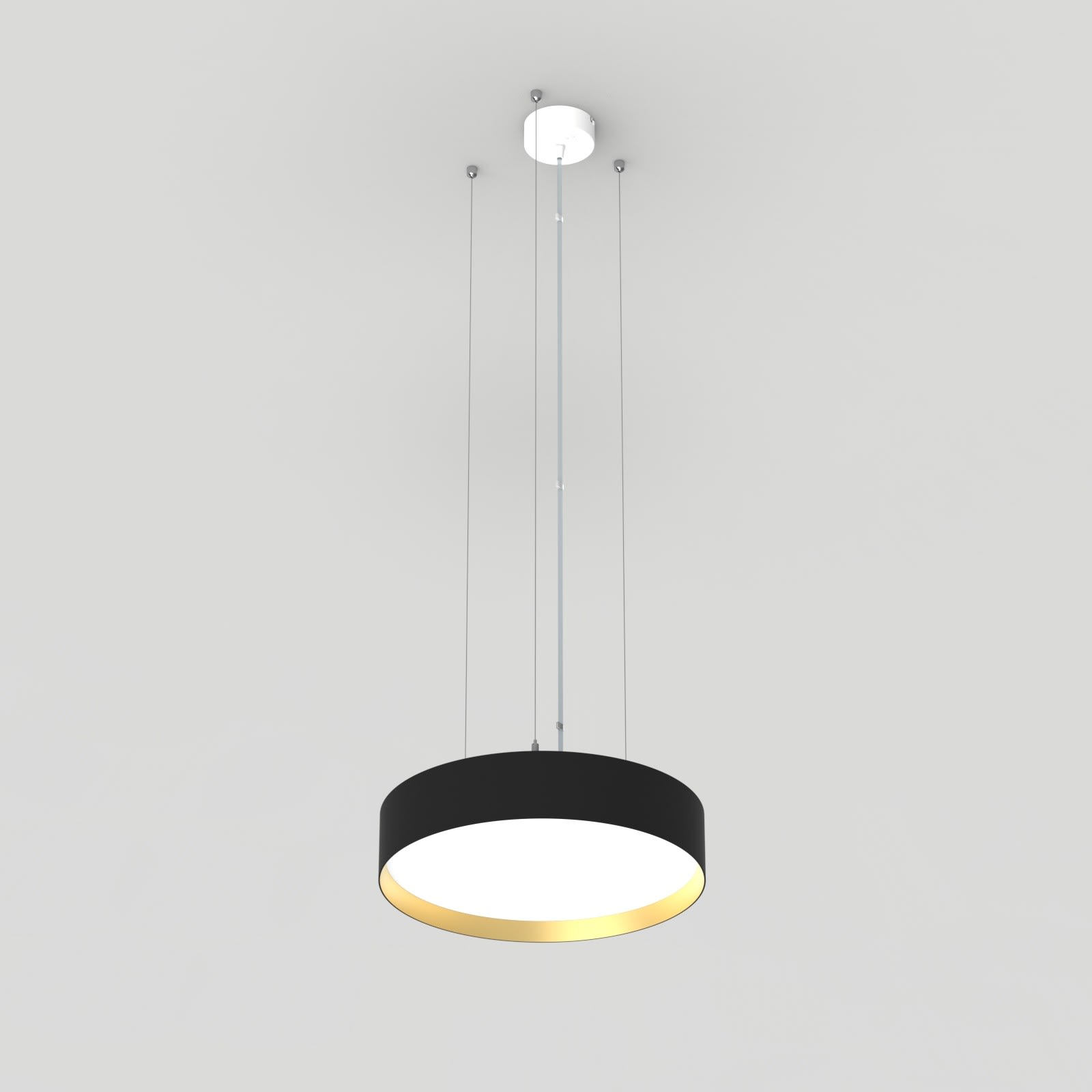 Luminaire LED de grande qualité avec boîtier de luminaire rondé au design plat en aluminium extrudé avec surface thermolaquée avec boîtier en revêtu par poudre RAL9005 noir fine matte et anneau décoratif 'glaring gold' pour montage en suspension avec émission indirecte de la lumière. Installation par 3 filins de suspension 1500 mm avec tendeurs rapides, avec réglage de la longueur. alimentation transparent 1750 mm avec patère blanche en saillie 100x36 mm (d.xh) incl.. Diffuseurs direct et indirect en polycarbonate satiné pour un éclairage homogène. Raccordement électrique par 5 pôles utilisés, Luminaire équipé d’une technologie LED innovante avec une efficacité de 102 lm par W et une flux lumineux sortant de 4165 lm lm pour 41 W, en température de couleur 3000 K. Nombre d'adresses DALI : 1. Convertisseur DALI pour gradation, Evaluation de l'éblouissement selon la classification selon DIN EN 12464-1.2021-11 avec UGR < 19, ’Melanopic Ratio’ = (0,57), Indice de rendu des couleurs (IRC) > 90, tolérance chromatique étroite MacAdam 3, Groupe de risque RG0 selon norme IEC 62471, durée de vie nominale > 60.000 h [selon le décret de l’UE], classe énergétique (EEI). Indice de protection IP50, classe de protection I. Sur demande, également en version éclairage de secours avec batterie de 3h ou dans la version avec capteur de mouvement et de luminosité contrôlable/programmable, Casambi également sur demande. Des télécommandes sont disponibles comme accessoires. L’éclairage d’urgence et le capteur ne peuvent pas être combinés. Des câbles design de différentes longueurs et couleurs sont disponibles en option pour l’alimentation, Option de commutateur : C, source lumineuse remplaçable par le fabricant, dispositif de commande remplaçable par un professionnel autorisé, Dimensions DMxH : 0420x091 mm, hauteur totale du boîtier de 110 mm et hauteur visible de 91 mm, poids : 3,7 kg