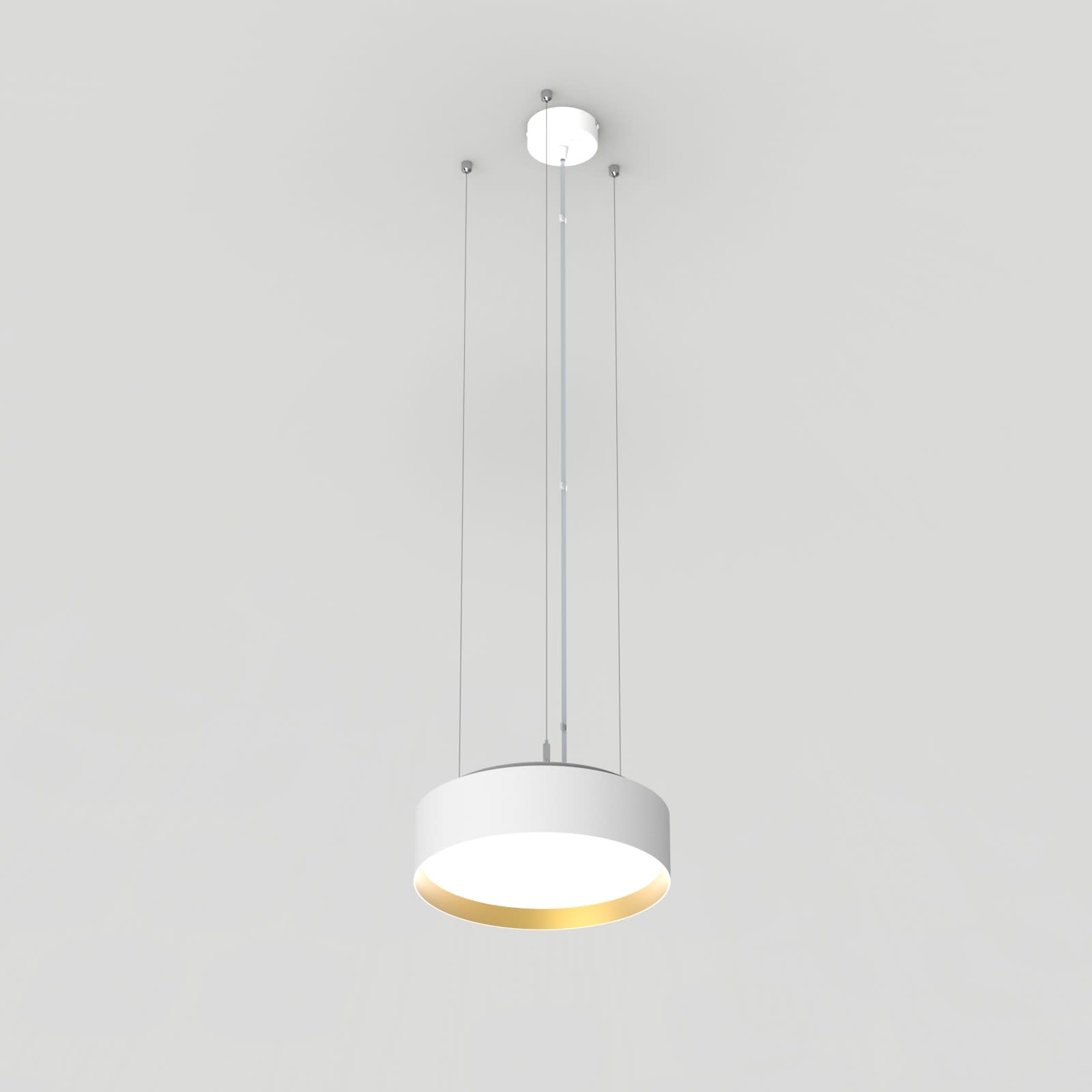 Luminaire LED de grande qualité avec boîtier de luminaire rondé au design plat en aluminium extrudé avec surface thermolaquée avec boîtier en revêtu par poudre RAL9016 blanc fine matte et anneau décoratif 'glaring gold' pour montage en suspension. Installation par 3 filins de suspension 1500 mm avec tendeurs rapides, avec réglage de la longueur. alimentation transparent 1750 mm avec patère blanche en saillie 100x36 mm (d.xh) incl.. Diffuseur en PMMA satiné pour un éclairage homogène. Raccordement électrique par 5 pôles utilisés, Luminaire équipé d’une technologie LED innovante avec une efficacité de 99 lm par W et une flux lumineux sortant de 1836 lm lm pour 18,5 W, en température de couleur 4000 K. Nombre d'adresses DALI : 1. Convertisseur DALI pour gradation, Evaluation de l'éblouissement selon la classification selon DIN EN 12464-1.2021-11 avec UGR < 25, ’Melanopic Ratio’ = (0,739), Indice de rendu des couleurs (IRC) > 90, tolérance chromatique étroite MacAdam 3, Groupe de risque RG0 selon norme IEC 62471, durée de vie nominale > 60.000 h [selon le décret de l’UE], classe énergétique (EEI). Indice de protection IP50, classe de protection I. Sur demande, également en version éclairage de secours avec batterie de 3h ou dans la version avec capteur de mouvement et de luminosité contrôlable/programmable, Casambi également sur demande. Des télécommandes sont disponibles comme accessoires. L’éclairage d’urgence et le capteur ne peuvent pas être combinés. Des câbles design de différentes longueurs et couleurs sont disponibles en option pour l’alimentation, Option de commutateur : C, source lumineuse remplaçable par le fabricant, dispositif de commande remplaçable par un professionnel autorisé, Dimensions DMxH : 0330x091 mm, hauteur totale du boîtier de 110 mm et hauteur visible de 91 mm, poids : 2,7 kg
