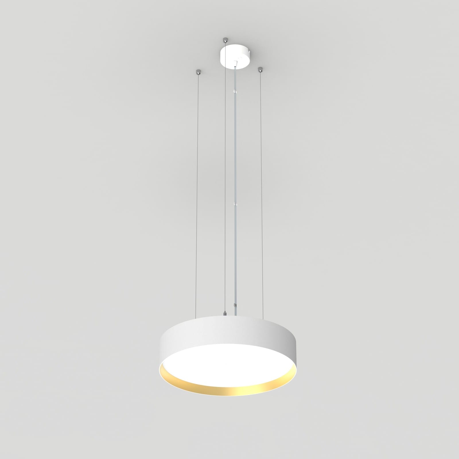 Luminaire LED de grande qualité avec boîtier de luminaire rondé au design plat en aluminium extrudé avec surface thermolaquée avec boîtier en revêtu par poudre RAL9016 blanc fine matte et anneau décoratif 'glaring gold' pour montage en suspension. Installation par 3 filins de suspension 1500 mm avec tendeurs rapides, avec réglage de la longueur. alimentation transparent 1750 mm avec patère blanche en saillie 100x36 mm (d.xh) incl.. Diffuseur en PMMA microprismatique pour une luminance réduite (LRA). Raccordement électrique par 5 pôles utilisés, Luminaire équipé d’une technologie LED innovante avec une efficacité de 94 lm par W et une flux lumineux sortant de 2626 lm lm pour 28 W, en température de couleur 4000 K. Nombre d'adresses DALI : 1. Convertisseur DALI pour gradation, Evaluation de l'éblouissement selon la classification selon DIN EN 12464-1.2021-11 avec UGR < 22, ’Melanopic Ratio’ = (0,739), Indice de rendu des couleurs (IRC) > 90, tolérance chromatique étroite MacAdam 3, Groupe de risque RG0 selon norme IEC 62471, durée de vie nominale > 60.000 h [selon le décret de l’UE], classe énergétique (EEI). Indice de protection IP50, classe de protection I. Sur demande, également en version éclairage de secours avec batterie de 3h ou dans la version avec capteur de mouvement et de luminosité contrôlable/programmable, Casambi également sur demande. Des télécommandes sont disponibles comme accessoires. L’éclairage d’urgence et le capteur ne peuvent pas être combinés. Des câbles design de différentes longueurs et couleurs sont disponibles en option pour l’alimentation, Option de commutateur : C, source lumineuse remplaçable par le fabricant, dispositif de commande remplaçable par un professionnel autorisé, Dimensions DMxH : 0420x091 mm, hauteur totale du boîtier de 110 mm et hauteur visible de 91 mm, poids : 3,4 kg