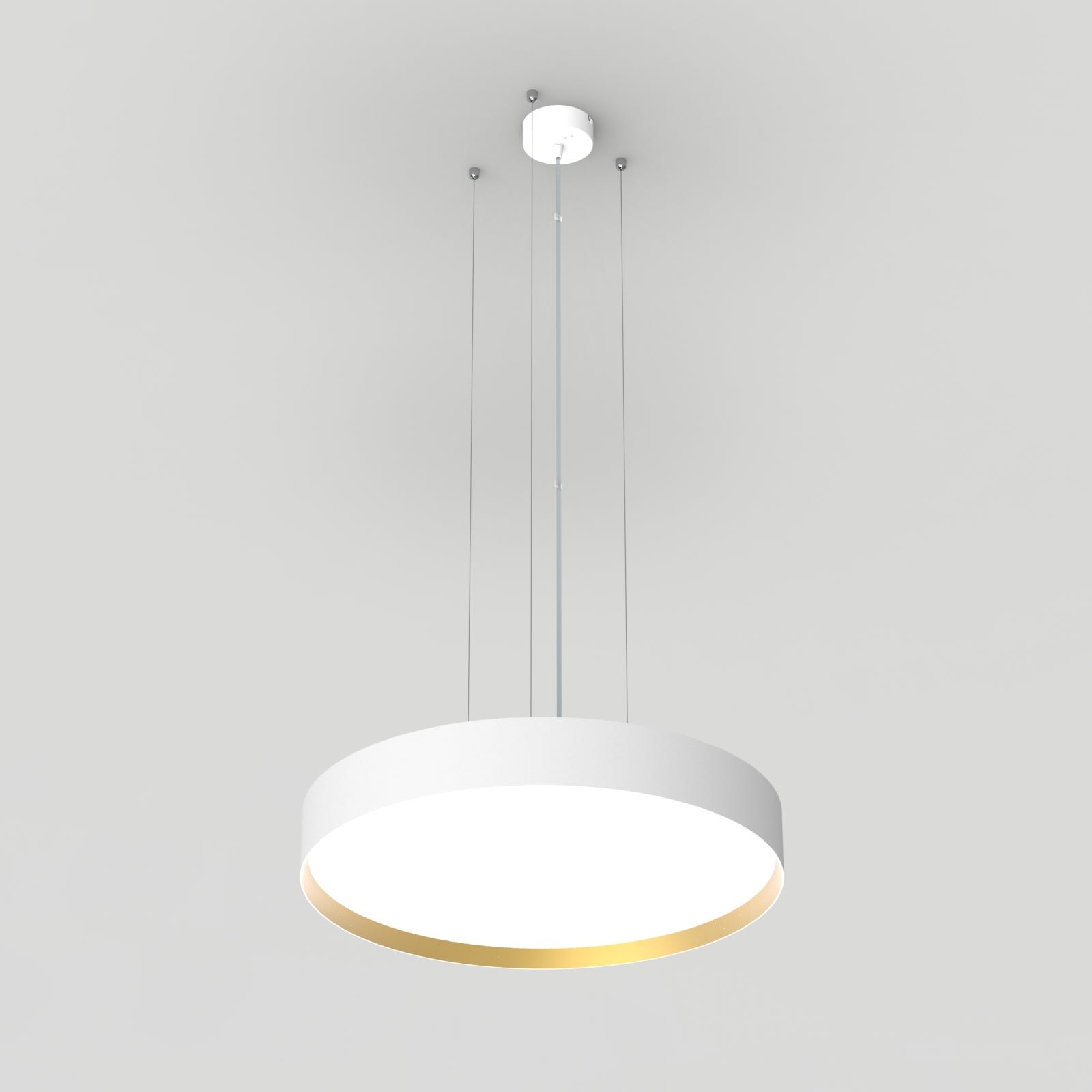 Luminaire LED de grande qualité avec boîtier de luminaire rondé au design plat en aluminium extrudé avec surface thermolaquée avec boîtier en revêtu par poudre RAL9016 blanc fine matte et anneau décoratif 'glaring gold' pour montage en suspension. Installation par 3 filins de suspension 1500 mm avec tendeurs rapides, avec réglage de la longueur. alimentation transparent 1750 mm avec patère blanche en saillie 100x36 mm (d.xh) incl.. Diffuseur en PMMA satiné pour un éclairage homogène. Raccordement électrique par 5 pôles utilisés, Luminaire équipé d’une technologie LED innovante avec une efficacité de 117 lm par W et une flux lumineux sortant de 5987 lm lm pour 51 W, en température de couleur 4000 K. Nombre d'adresses DALI : 1. Convertisseur DALI pour gradation, Evaluation de l'éblouissement selon la classification selon DIN EN 12464-1.2021-11 avec UGR < 25, ’Melanopic Ratio’ = (0,739), Indice de rendu des couleurs (IRC) > 90, tolérance chromatique étroite MacAdam 3, Groupe de risque RG0 selon norme IEC 62471, durée de vie nominale > 60.000 h [selon le décret de l’UE], classe énergétique (EEI). Indice de protection IP50, classe de protection I. Sur demande, également en version éclairage de secours avec batterie de 3h ou dans la version avec capteur de mouvement et de luminosité contrôlable/programmable, Casambi également sur demande. Des télécommandes sont disponibles comme accessoires. L’éclairage d’urgence et le capteur ne peuvent pas être combinés. Des câbles design de différentes longueurs et couleurs sont disponibles en option pour l’alimentation, Option de commutateur : C, source lumineuse remplaçable par le fabricant, dispositif de commande remplaçable par un professionnel autorisé, Dimensions DMxH : 0620x091 mm, hauteur totale du boîtier de 110 mm et hauteur visible de 91 mm, poids : 5,5 kg