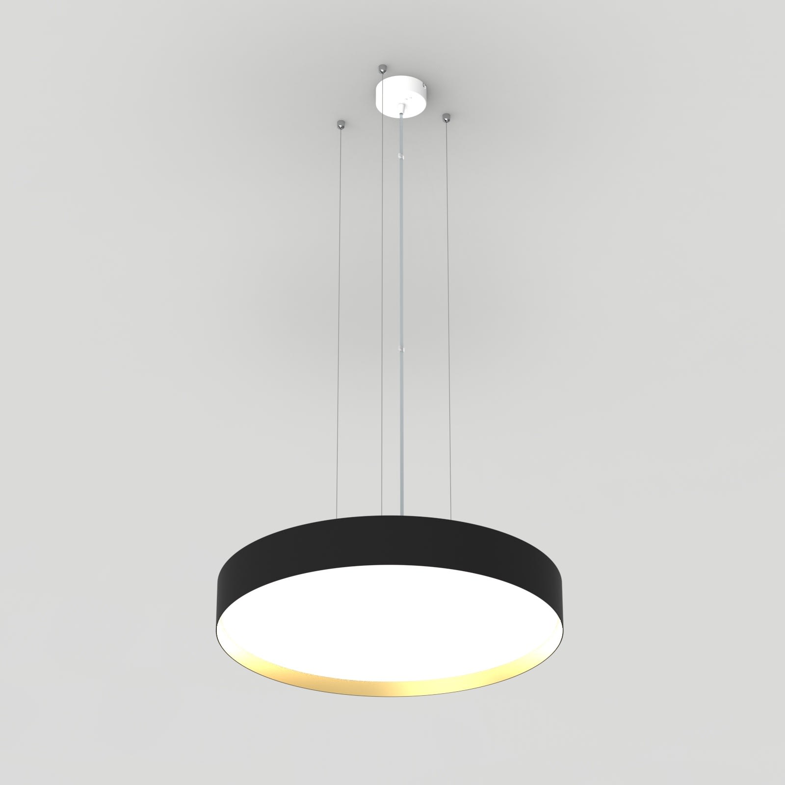 Luminaire LED de grande qualité avec boîtier de luminaire rondé au design plat en aluminium extrudé avec surface thermolaquée avec boîtier en revêtu par poudre RAL9005 noir fine matte et anneau décoratif 'glaring gold' pour montage en suspension. Installation par 3 filins de suspension 1500 mm avec tendeurs rapides, avec réglage de la longueur. alimentation transparent 1750 mm avec patère blanche en saillie 100x36 mm (d.xh) incl.. Diffuseur en PMMA microprismatique pour une luminance réduite (LRA). Raccordement électrique par 5 pôles utilisés, Luminaire équipé d’une technologie LED innovante avec une efficacité de 105 lm par W et une flux lumineux sortant de 5336 lm lm pour 51 W, en température de couleur 4000 K. Nombre d'adresses DALI : 1. Convertisseur DALI pour gradation, Evaluation de l'éblouissement selon la classification selon DIN EN 12464-1.2021-11 avec UGR < 22, ’Melanopic Ratio’ = (0,739), Indice de rendu des couleurs (IRC) > 90, tolérance chromatique étroite MacAdam 3, Groupe de risque RG0 selon norme IEC 62471, durée de vie nominale > 60.000 h [selon le décret de l’UE], classe énergétique (EEI). Indice de protection IP50, classe de protection I. Sur demande, également en version éclairage de secours avec batterie de 3h ou dans la version avec capteur de mouvement et de luminosité contrôlable/programmable, Casambi également sur demande. Des télécommandes sont disponibles comme accessoires. L’éclairage d’urgence et le capteur ne peuvent pas être combinés. Des câbles design de différentes longueurs et couleurs sont disponibles en option pour l’alimentation, Option de commutateur : C, source lumineuse remplaçable par le fabricant, dispositif de commande remplaçable par un professionnel autorisé, Dimensions DMxH : 0620x091 mm, hauteur totale du boîtier de 110 mm et hauteur visible de 91 mm, poids : 5,5 kg