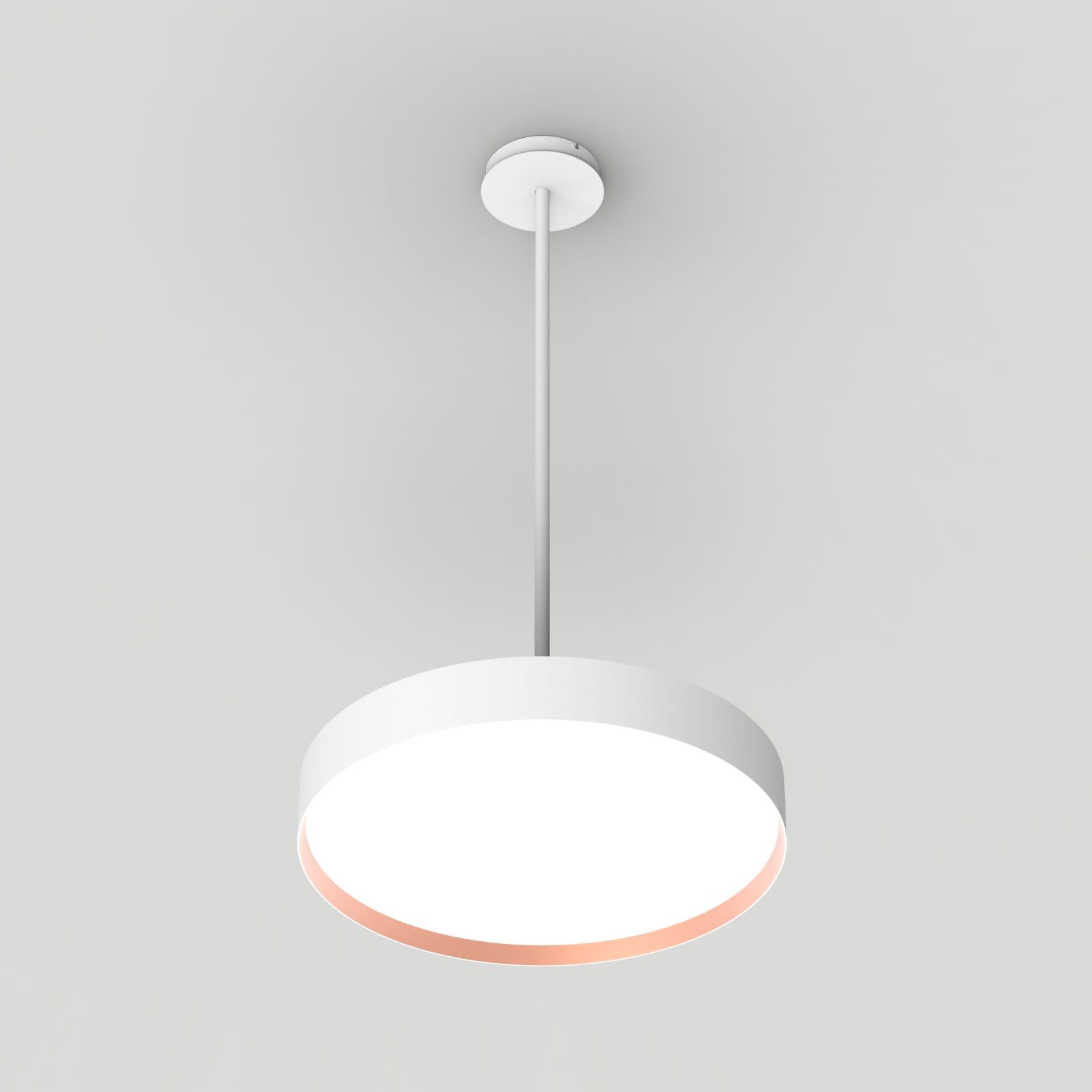 Luminaire LED de grande qualité avec boîtier de luminaire rondé au design plat en aluminium extrudé avec surface thermolaquée avec boîtier en revêtu par poudre RAL9016 blanc fine matte et anneau décoratif 'capital copper' pour montage en suspension rigide avec émission indirecte de la lumière. Installation par Suspension rigide 'Pende' d'un diamètre de 20 mm, d'une longueur de 1000 mm, en supplément de 2000 mm commandable, raccourcissable individuellement et avec alimentation transparente guidée intérieurement. anneau décoratif 'capital copper'. 'Pende' en couleur de boîtier, revêtement en poudre en, incl. suspension rigide 1000 mm en blanc, individuellement raccourcissablepatère de plafond en blanc avec 177x36 mm (d.xh) incl... Diffuseurs direct et indirect en polycarbonate satiné pour un éclairage homogène. Raccordement électrique par 5 pôles utilisés, Luminaire équipé d’une technologie LED innovante avec une efficacité de 120 lm par W et une flux lumineux sortant de 9138 lm lm pour 76 W, en température de couleur 4000 K. Nombre d'adresses DALI : 2. Convertisseur DALI pour gradation, Evaluation de l'éblouissement selon la classification selon DIN EN 12464-1.2021-11 avec UGR < 22, ’Melanopic Ratio’ = (0,739), Indice de rendu des couleurs (IRC) > 90, tolérance chromatique étroite MacAdam 3, Groupe de risque RG0 selon norme IEC 62471, durée de vie nominale > 60.000 h [selon le décret de l’UE], classe énergétique (EEI). Indice de protection IP50, classe de protection I. Sur demande, également en version avec capteur de mouvement et de luminosité contrôlable/programmable, Casambi également sur demande. Des télécommandes sont disponibles comme accessoires. Option de commutateur : C, source lumineuse remplaçable par le fabricant, dispositif de commande remplaçable par un professionnel autorisé, Dimensions DMxH : 0620x091 mm, hauteur totale du boîtier de 110 mm et hauteur visible de 91 mm, poids : 7,2 kg