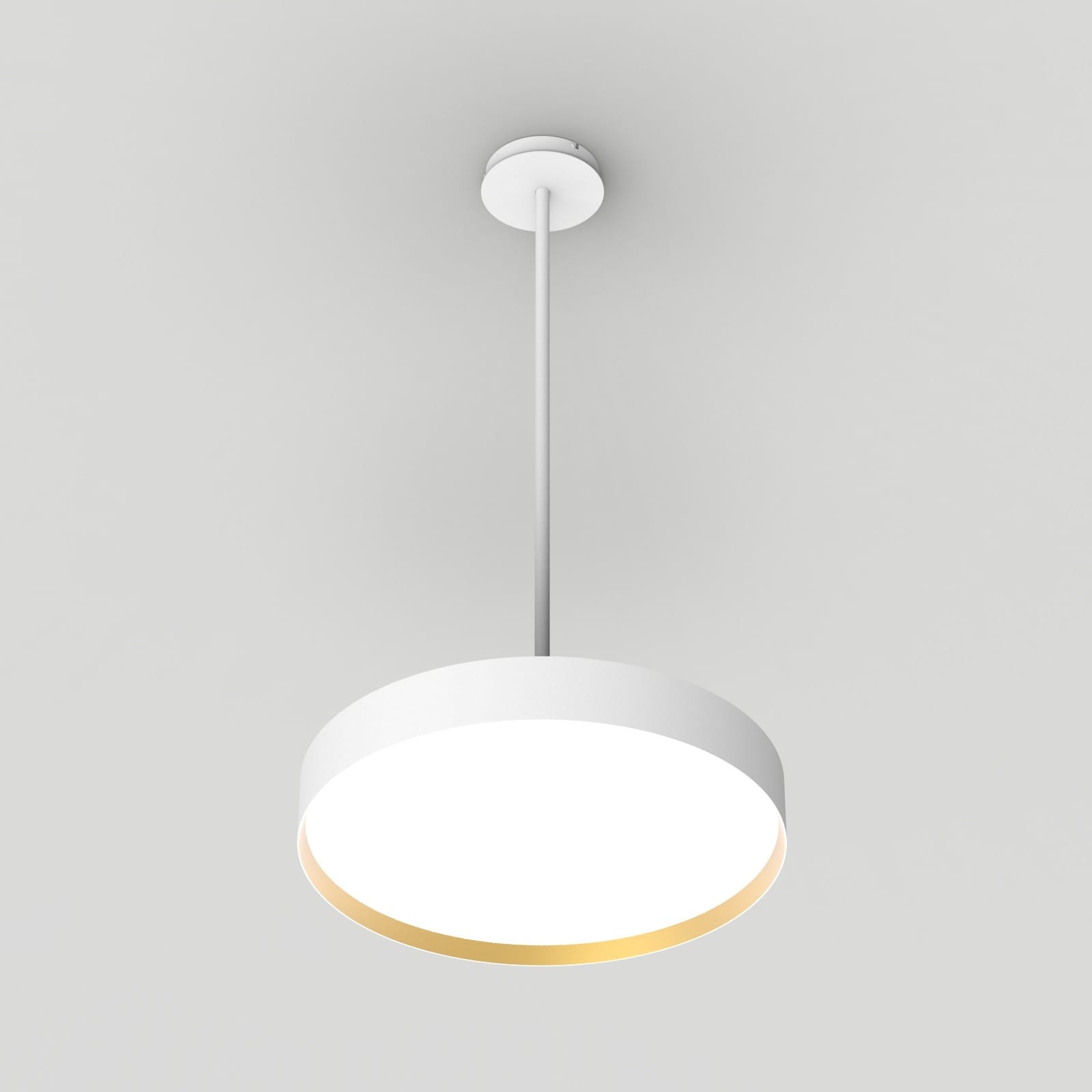 Luminaire LED de grande qualité avec boîtier de luminaire rondé au design plat en aluminium extrudé avec surface thermolaquée avec boîtier en revêtu par poudre RAL9016 blanc fine matte et anneau décoratif 'glaring gold' pour montage en suspension rigide avec émission indirecte de la lumière. Installation par Suspension rigide 'Pende' d'un diamètre de 20 mm, d'une longueur de 1000 mm, en supplément de 2000 mm commandable, raccourcissable individuellement et avec alimentation transparente guidée intérieurement. anneau décoratif 'glaring gold'. 'Pende' en couleur de boîtier, revêtement en poudre en, incl. suspension rigide 1000 mm en blanc, individuellement raccourcissablepatère de plafond en blanc avec 177x36 mm (d.xh) incl... Diffuseurs direct et indirect en polycarbonate satiné pour un éclairage homogène. Raccordement électrique par 5 pôles utilisés, Luminaire équipé d’une technologie LED innovante avec une efficacité de 123 lm par W et une flux lumineux sortant de 9385 lm lm pour 76 W, en température de couleur 4000 K. Nombre d'adresses DALI : 2. Convertisseur DALI pour gradation, Evaluation de l'éblouissement selon la classification selon DIN EN 12464-1.2021-11 avec UGR < 22, ’Melanopic Ratio’ = (0,739), Indice de rendu des couleurs (IRC) > 90, tolérance chromatique étroite MacAdam 3, Groupe de risque RG0 selon norme IEC 62471, durée de vie nominale > 60.000 h [selon le décret de l’UE], classe énergétique (EEI). Indice de protection IP50, classe de protection I. Sur demande, également en version avec capteur de mouvement et de luminosité contrôlable/programmable, Casambi également sur demande. Des télécommandes sont disponibles comme accessoires. Option de commutateur : C, source lumineuse remplaçable par le fabricant, dispositif de commande remplaçable par un professionnel autorisé, Dimensions DMxH : 0620x091 mm, hauteur totale du boîtier de 110 mm et hauteur visible de 91 mm, poids : 7,2 kg