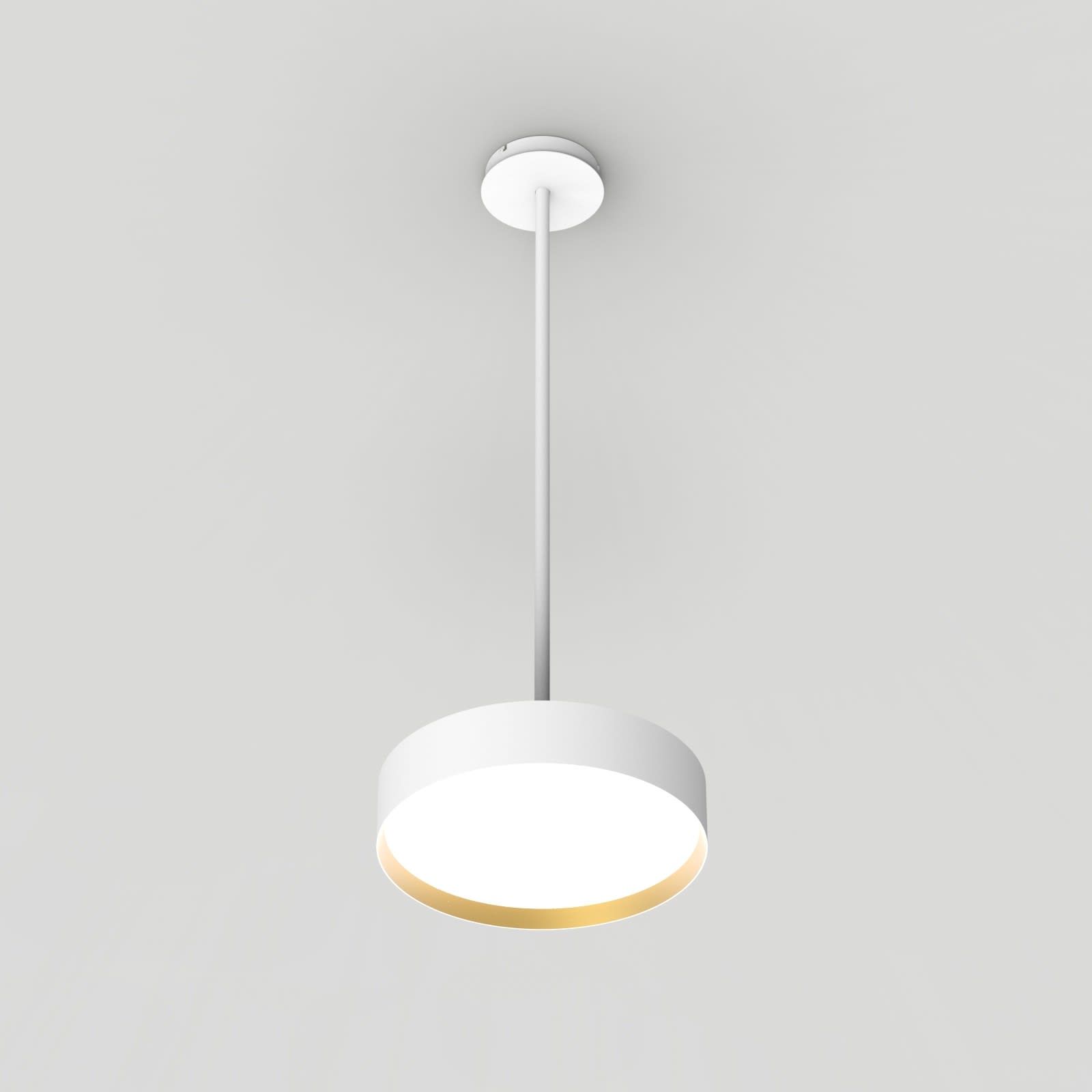 Luminaire LED de grande qualité avec boîtier de luminaire rondé au design plat en aluminium extrudé avec surface thermolaquée avec boîtier en revêtu par poudre RAL9016 blanc fine matte et anneau décoratif 'glaring gold' pour montage en suspension rigide. Installation par Suspension rigide 'Pende' d'un diamètre de 20 mm, d'une longueur de 1000 mm, en supplément de 2000 mm commandable, raccourcissable individuellement et avec alimentation transparente guidée intérieurement. anneau décoratif 'glaring gold'. 'Pende' en couleur de boîtier, revêtement en poudre en, incl. suspension rigide 1000 mm en blanc, individuellement raccourcissablepatère de plafond en blanc avec 177x36 mm (d.xh) incl... Diffuseur en PMMA microprismatique pour une luminance réduite (LRA). Raccordement électrique par 5 pôles utilisés, Luminaire équipé d’une technologie LED innovante avec une efficacité de 95 lm par W et une flux lumineux sortant de 2092 lm lm pour 22 W, en température de couleur 4000 K. Nombre d'adresses DALI : 1. Convertisseur DALI pour gradation, Evaluation de l'éblouissement selon la classification selon DIN EN 12464-1.2021-11 avec UGR < 22, luminaire de poste de travail compatible écran selon DIN EN 12464-1 (luminosité à 65° <= 3000 cd/m²), ’Melanopic Ratio’ = (0,739), Indice de rendu des couleurs (IRC) > 90, tolérance chromatique étroite MacAdam 3, Groupe de risque RG0 selon norme IEC 62471, durée de vie nominale > 60.000 h [selon le décret de l’UE], classe énergétique (EEI). Indice de protection IP50, classe de protection I. Sur demande, également en version éclairage de secours avec batterie de 3h ou dans la version avec capteur de mouvement et de luminosité contrôlable/programmable, Casambi également sur demande. Des télécommandes sont disponibles comme accessoires. L’éclairage d’urgence et le capteur ne peuvent pas être combinés. Option de commutateur : C, source lumineuse remplaçable par le fabricant, dispositif de commande remplaçable par un professionnel autorisé, Dimensions DMxH : 0420x091 mm, hauteur totale du boîtier de 110 mm et hauteur visible de 91 mm, poids : 4,3 kg