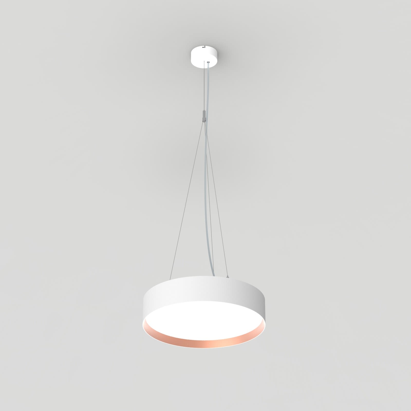 Luminaire LED de grande qualité avec boîtier de luminaire rondé au design plat en aluminium extrudé avec surface thermolaquée avec boîtier en revêtu par poudre RAL9016 blanc fine matte et anneau décoratif 'capital copper' au centre pour un montage en suspension. Installation par 3 filins de suspension, 1 support de câble avec noeud, avec réglage de la longueur. alimentation transparent 1750 mm avec patère blanche en saillie 100x36 mm (d.xh) incl.. Diffuseur en PMMA satiné pour un éclairage homogène. Raccordement électrique par 5 pôles utilisés, Luminaire équipé d’une technologie LED innovante avec une efficacité de 100 lm par W et une flux lumineux sortant de 2793 lm lm pour 28 W, en température de couleur 4000 K. Nombre d'adresses DALI : 1. Convertisseur DALI pour gradation, Evaluation de l'éblouissement selon la classification selon DIN EN 12464-1.2021-11 avec UGR < 25, ’Melanopic Ratio’ = (0,739), Indice de rendu des couleurs (IRC) > 90, tolérance chromatique étroite MacAdam 3, Groupe de risque RG0 selon norme IEC 62471, durée de vie nominale > 60.000 h [selon le décret de l’UE], classe énergétique (EEI). Indice de protection IP50, classe de protection I. Sur demande, également en version éclairage de secours avec batterie de 3h ou dans la version avec capteur de mouvement et de luminosité contrôlable/programmable, Casambi également sur demande. Des télécommandes sont disponibles comme accessoires. L’éclairage d’urgence et le capteur ne peuvent pas être combinés. Option de commutateur : C, source lumineuse remplaçable par le fabricant, dispositif de commande remplaçable par un professionnel autorisé, Dimensions DMxH : 0420x091 mm, hauteur totale du boîtier de 110 mm et hauteur visible de 91 mm, poids : 3,4 kg