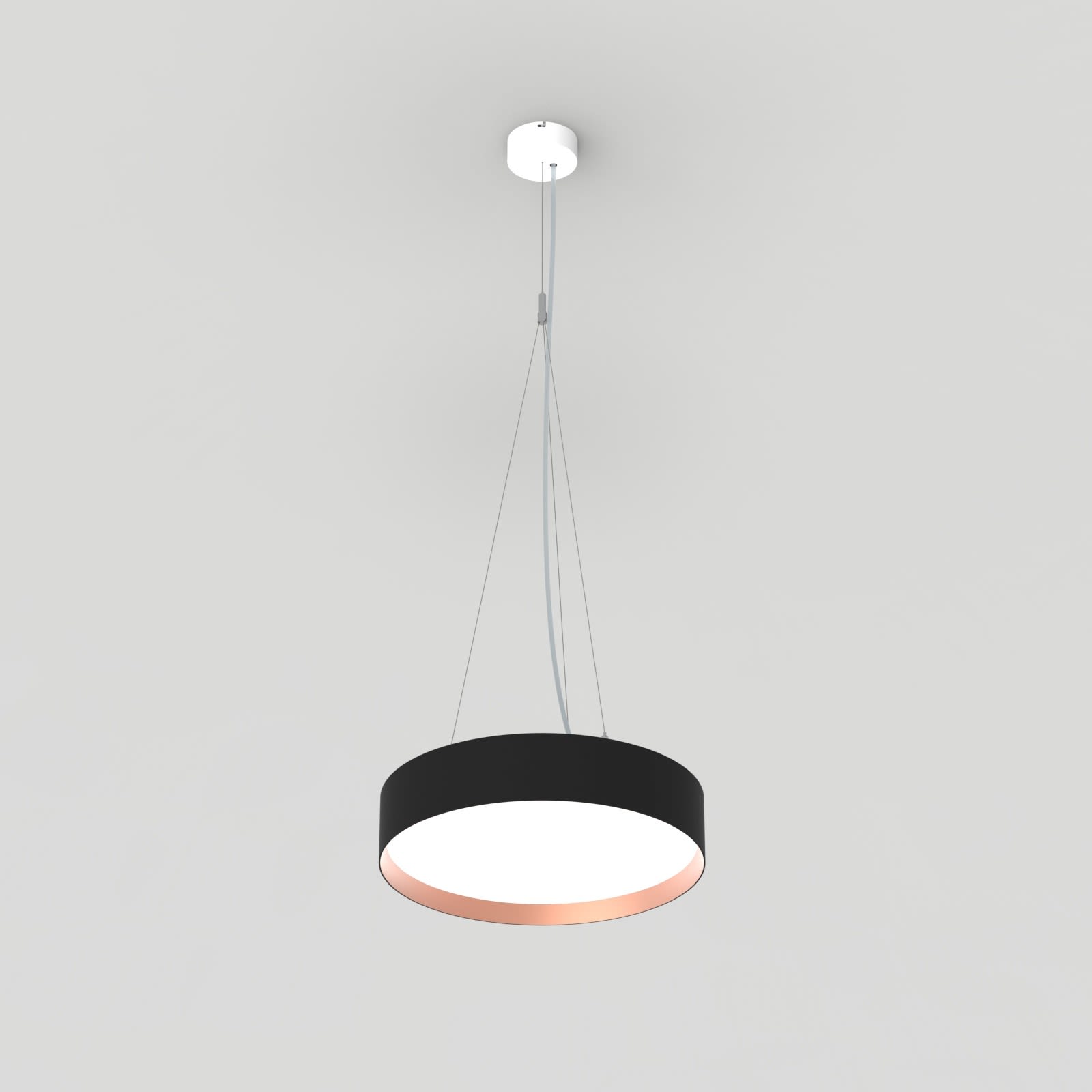 Luminaire LED de grande qualité avec boîtier de luminaire rondé au design plat en aluminium extrudé avec surface thermolaquée avec boîtier en revêtu par poudre RAL9005 noir fine matte et anneau décoratif 'capital copper' au centre pour un montage en suspension avec émission indirecte de la lumière. Installation par 3 filins de suspension, 1 support de câble avec noeud, avec réglage de la longueur. alimentation transparent 1750 mm avec patère blanche en saillie 100x36 mm (d.xh) incl.. Diffuseur direct en polycarbonate microprismatique pour une luminance réduite (LRA), indirect en PMMA satiné. Raccordement électrique par 5 pôles utilisés, Luminaire équipé d’une technologie LED innovante avec une efficacité de 98 lm par W et une flux lumineux sortant de 4002 lm lm pour 41 W, en température de couleur 4000 K. Nombre d'adresses DALI : 1. Convertisseur DALI pour gradation, Evaluation de l'éblouissement selon la classification selon DIN EN 12464-1.2021-11 avec UGR < 19, ’Melanopic Ratio’ = (0,739), Indice de rendu des couleurs (IRC) > 90, tolérance chromatique étroite MacAdam 3, Groupe de risque RG0 selon norme IEC 62471, durée de vie nominale > 60.000 h [selon le décret de l’UE], classe énergétique (EEI). Indice de protection IP50, classe de protection I. Sur demande, également en version éclairage de secours avec batterie de 3h ou dans la version avec capteur de mouvement et de luminosité contrôlable/programmable, Casambi également sur demande. Des télécommandes sont disponibles comme accessoires. L’éclairage d’urgence et le capteur ne peuvent pas être combinés. Option de commutateur : C, source lumineuse remplaçable par le fabricant, dispositif de commande remplaçable par un professionnel autorisé, Dimensions DMxH : 0420x091 mm, hauteur totale du boîtier de 110 mm et hauteur visible de 91 mm, poids : 3,7 kg