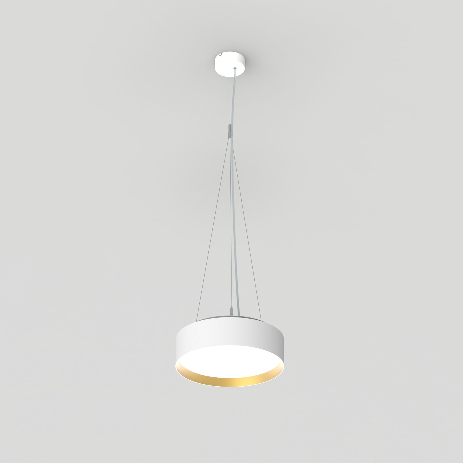 Luminaire LED de grande qualité avec boîtier de luminaire rondé au design plat en aluminium extrudé avec surface thermolaquée avec boîtier en revêtu par poudre RAL9016 blanc fine matte et anneau décoratif 'glaring gold' au centre pour un montage en suspension avec émission indirecte de la lumière. Installation par 3 filins de suspension, 1 support de câble avec noeud, avec réglage de la longueur. alimentation transparent 1750 mm avec patère blanche en saillie 100x36 mm (d.xh) incl.. Diffuseurs direct et indirect en polycarbonate satiné pour un éclairage homogène. Raccordement électrique par 5 pôles utilisés, Luminaire équipé d’une technologie LED innovante avec une efficacité de 96 lm par W et une flux lumineux sortant de 2682 lm lm pour 28 W, en température de couleur 4000 K. Nombre d'adresses DALI : 1. Convertisseur DALI pour gradation, Evaluation de l'éblouissement selon la classification selon DIN EN 12464-1.2021-11 avec UGR < 22, ’Melanopic Ratio’ = (0,739), Indice de rendu des couleurs (IRC) > 90, tolérance chromatique étroite MacAdam 3, Groupe de risque RG0 selon norme IEC 62471, durée de vie nominale > 60.000 h [selon le décret de l’UE], classe énergétique (EEI). Indice de protection IP50, classe de protection I. Sur demande, également en version éclairage de secours avec batterie de 3h ou dans la version avec capteur de mouvement et de luminosité contrôlable/programmable, Casambi également sur demande. Des télécommandes sont disponibles comme accessoires. L’éclairage d’urgence et le capteur ne peuvent pas être combinés. Option de commutateur : C, source lumineuse remplaçable par le fabricant, dispositif de commande remplaçable par un professionnel autorisé, Dimensions DMxH : 0330x091 mm, hauteur totale du boîtier de 110 mm et hauteur visible de 91 mm, poids : 2,8 kg