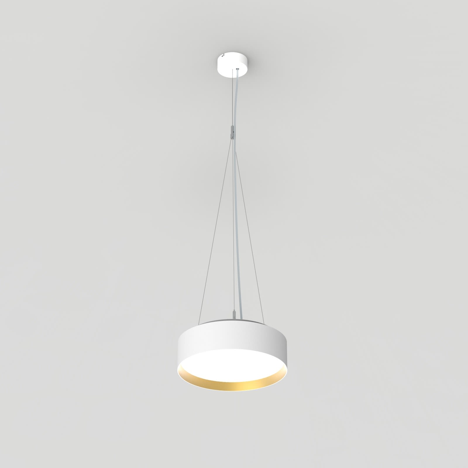 Luminaire LED de grande qualité avec boîtier de luminaire rondé au design plat en aluminium extrudé avec surface thermolaquée avec boîtier en revêtu par poudre RAL9016 blanc fine matte et anneau décoratif 'glaring gold' au centre pour un montage en suspension. Installation par 3 filins de suspension, 1 support de câble avec noeud, avec réglage de la longueur. alimentation transparent 1750 mm avec patère blanche en saillie 100x36 mm (d.xh) incl.. Diffuseur en PMMA microprismatique pour une luminance réduite (LRA). Raccordement électrique par 5 pôles utilisés, Luminaire équipé d’une technologie LED innovante avec une efficacité de 92 lm par W et une flux lumineux sortant de 1703 lm lm pour 18,5 W, en température de couleur 4000 K. Nombre d'adresses DALI : 1. Convertisseur DALI pour gradation, Evaluation de l'éblouissement selon la classification selon DIN EN 12464-1.2021-11 avec UGR < 22, ’Melanopic Ratio’ = (0,739), Indice de rendu des couleurs (IRC) > 90, tolérance chromatique étroite MacAdam 3, Groupe de risque RG0 selon norme IEC 62471, durée de vie nominale > 60.000 h [selon le décret de l’UE], classe énergétique (EEI). Indice de protection IP50, classe de protection I. Sur demande, également en version éclairage de secours avec batterie de 3h ou dans la version avec capteur de mouvement et de luminosité contrôlable/programmable, Casambi également sur demande. Des télécommandes sont disponibles comme accessoires. L’éclairage d’urgence et le capteur ne peuvent pas être combinés. Option de commutateur : C, source lumineuse remplaçable par le fabricant, dispositif de commande remplaçable par un professionnel autorisé, Dimensions DMxH : 0330x091 mm, hauteur totale du boîtier de 110 mm et hauteur visible de 91 mm, poids : 2,7 kg