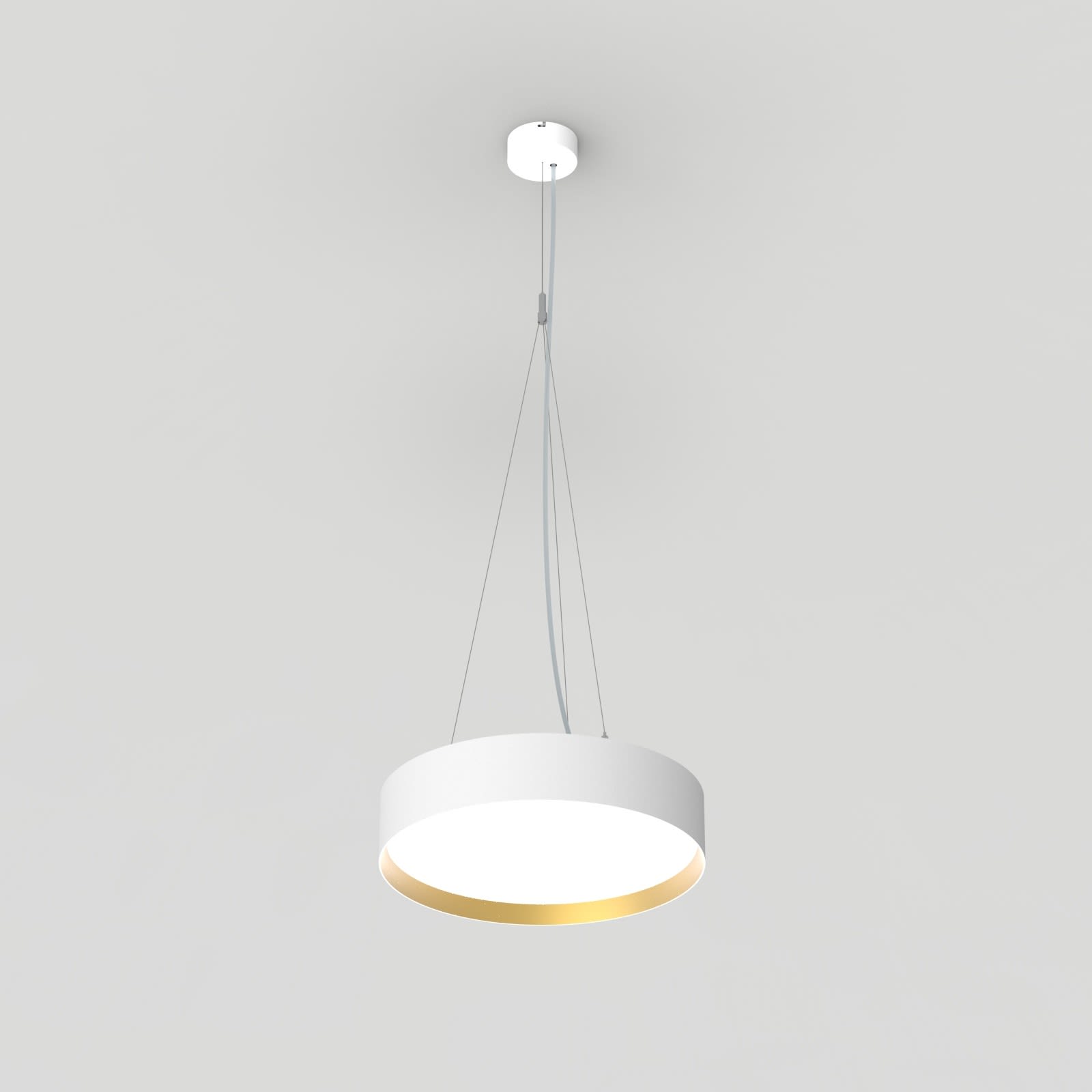 Luminaire LED de grande qualité avec boîtier de luminaire rondé au design plat en aluminium extrudé avec surface thermolaquée avec boîtier en revêtu par poudre RAL9016 blanc fine matte et anneau décoratif 'glaring gold' au centre pour un montage en suspension. Installation par 3 filins de suspension, 1 support de câble avec noeud, avec réglage de la longueur. alimentation transparent 1750 mm avec patère blanche en saillie 100x36 mm (d.xh) incl.. Diffuseur en PMMA microprismatique pour une luminance réduite (LRA). Raccordement électrique par 5 pôles utilisés, Luminaire équipé d’une technologie LED innovante avec une efficacité de 91 lm par W et une flux lumineux sortant de 1997 lm lm pour 22 W, en température de couleur 3000 K. Nombre d'adresses DALI : 1. Convertisseur DALI pour gradation, Evaluation de l'éblouissement selon la classification selon DIN EN 12464-1.2021-11 avec UGR < 22, luminaire de poste de travail compatible écran selon DIN EN 12464-1 (luminosité à 65° <= 3000 cd/m²), ’Melanopic Ratio’ = (0,57), Indice de rendu des couleurs (IRC) > 90, tolérance chromatique étroite MacAdam 3, Groupe de risque RG0 selon norme IEC 62471, durée de vie nominale > 60.000 h [selon le décret de l’UE], classe énergétique (EEI). Indice de protection IP50, classe de protection I. Sur demande, également en version éclairage de secours avec batterie de 3h ou dans la version avec capteur de mouvement et de luminosité contrôlable/programmable, Casambi également sur demande. Des télécommandes sont disponibles comme accessoires. L’éclairage d’urgence et le capteur ne peuvent pas être combinés. Option de commutateur : C, source lumineuse remplaçable par le fabricant, dispositif de commande remplaçable par un professionnel autorisé, Dimensions DMxH : 0420x091 mm, hauteur totale du boîtier de 110 mm et hauteur visible de 91 mm, poids : 3,4 kg
