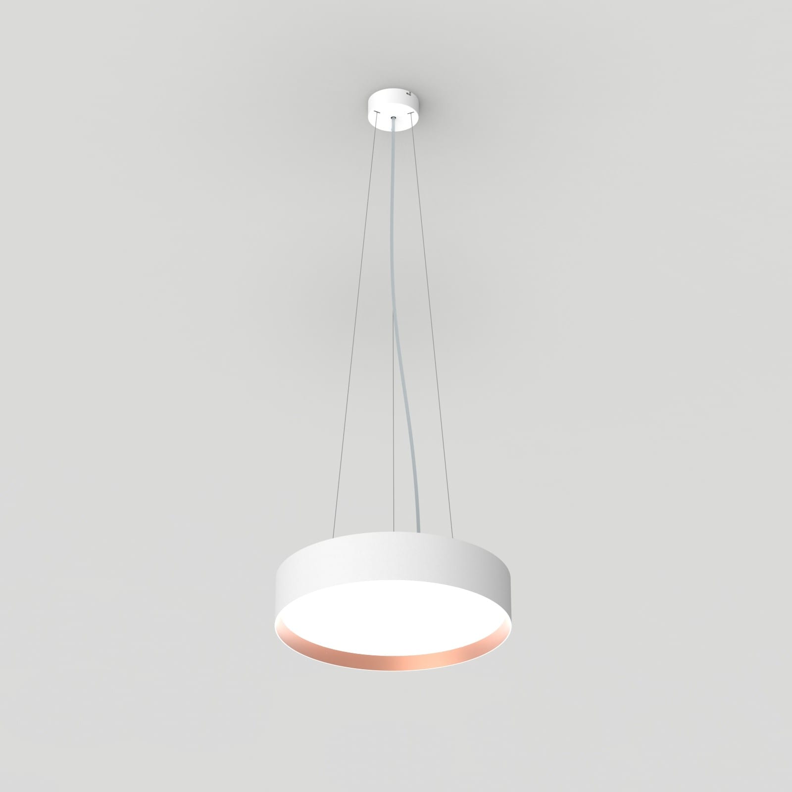 Luminaire LED de grande qualité avec boîtier de luminaire rondé au design plat en aluminium extrudé avec surface thermolaquée avec boîtier en revêtu par poudre RAL9016 blanc fine matte et anneau décoratif 'capital copper' pour un montage en suspension au centre de la fusion,. Installation par 3 filins de suspension, avec réglage de la longueur. alimentation transparent 1750 mm avec patère blanche en saillie 100x36 mm (d.xh) incl.. Diffuseur en PMMA microprismatique pour une luminance réduite (LRA). Raccordement électrique par 5 pôles utilisés, Luminaire équipé d’une technologie LED innovante avec une efficacité de 92 lm par W et une flux lumineux sortant de 2019 lm lm pour 22 W, en température de couleur 4000 K. Nombre d'adresses DALI : 1. Convertisseur DALI pour gradation, Evaluation de l'éblouissement selon la classification selon DIN EN 12464-1.2021-11 avec UGR < 22, luminaire de poste de travail compatible écran selon DIN EN 12464-1 (luminosité à 65° <= 3000 cd/m²), ’Melanopic Ratio’ = (0,739), Indice de rendu des couleurs (IRC) > 90, tolérance chromatique étroite MacAdam 3, Groupe de risque RG0 selon norme IEC 62471, durée de vie nominale > 60.000 h [selon le décret de l’UE], classe énergétique (EEI). Indice de protection IP50, classe de protection I. Sur demande, également en version éclairage de secours avec batterie de 3h ou dans la version avec capteur de mouvement et de luminosité contrôlable/programmable, Casambi également sur demande. Des télécommandes sont disponibles comme accessoires. L’éclairage d’urgence et le capteur ne peuvent pas être combinés. Option de commutateur : C, source lumineuse remplaçable par le fabricant, dispositif de commande remplaçable par un professionnel autorisé, Dimensions DMxH : 0420x091 mm, hauteur totale du boîtier de 110 mm et hauteur visible de 91 mm, poids : 3,4 kg