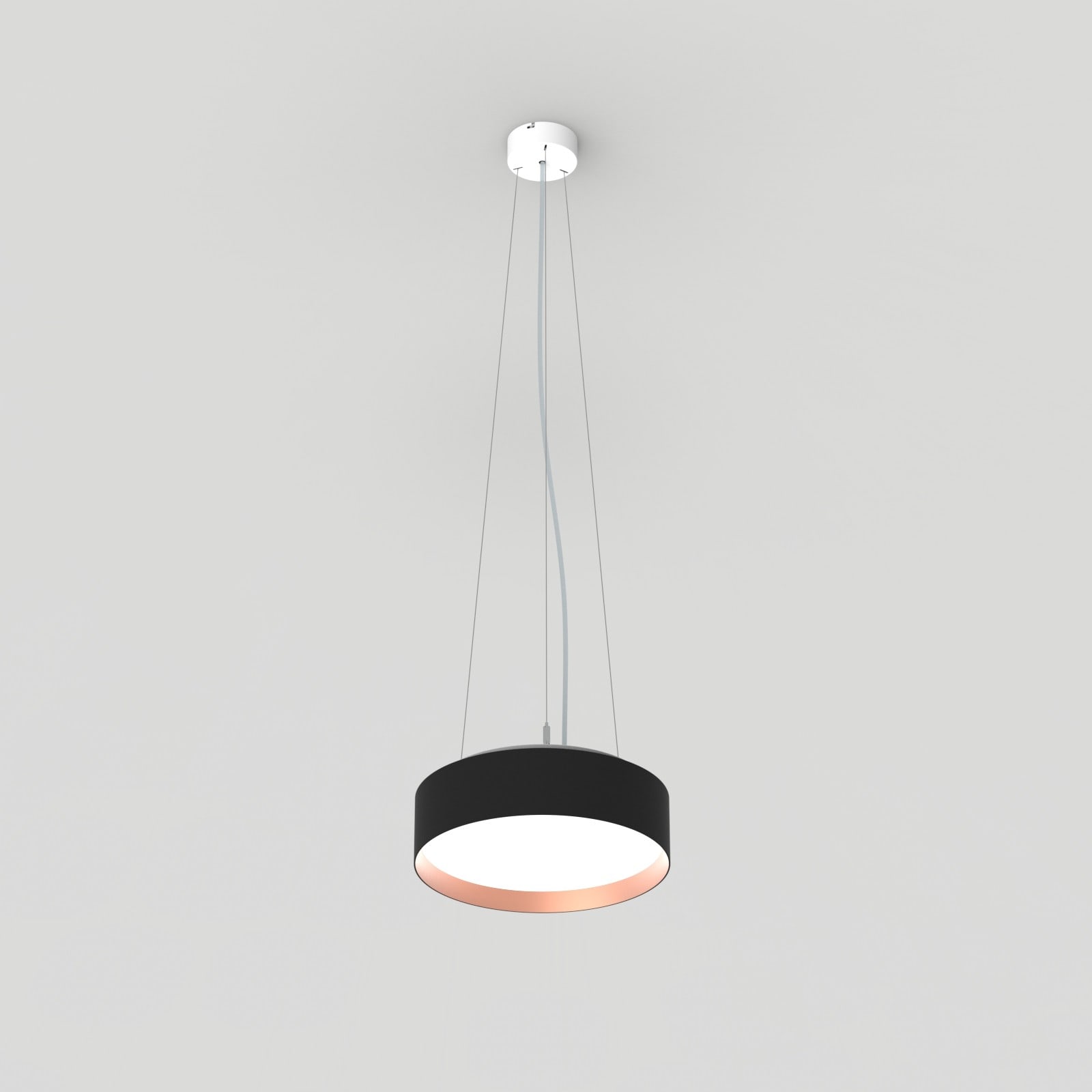 Luminaire LED de grande qualité avec boîtier de luminaire rondé au design plat en aluminium extrudé avec surface thermolaquée avec boîtier en revêtu par poudre RAL9005 noir fine matte et anneau décoratif 'capital copper' pour un montage en suspension au centre de la fusion, avec émission indirecte de la lumière. Installation par 3 filins de suspension, avec réglage de la longueur. alimentation transparent 1750 mm avec patère blanche en saillie 100x36 mm (d.xh) incl.. Diffuseurs direct et indirect en polycarbonate satiné pour un éclairage homogène. Raccordement électrique par 5 pôles utilisés, Luminaire équipé d’une technologie LED innovante avec une efficacité de 80 lm par W et une flux lumineux sortant de 2244 lm lm pour 28 W, en température de couleur 4000 K. Nombre d'adresses DALI : 1. Convertisseur DALI pour gradation, Evaluation de l'éblouissement selon la classification selon DIN EN 12464-1.2021-11 avec UGR < 22, ’Melanopic Ratio’ = (0,739), Indice de rendu des couleurs (IRC) > 90, tolérance chromatique étroite MacAdam 3, Groupe de risque RG0 selon norme IEC 62471, durée de vie nominale > 60.000 h [selon le décret de l’UE], classe énergétique (EEI). Indice de protection IP50, classe de protection I. Sur demande, également en version éclairage de secours avec batterie de 3h ou dans la version avec capteur de mouvement et de luminosité contrôlable/programmable, Casambi également sur demande. Des télécommandes sont disponibles comme accessoires. L’éclairage d’urgence et le capteur ne peuvent pas être combinés. Option de commutateur : C, source lumineuse remplaçable par le fabricant, dispositif de commande remplaçable par un professionnel autorisé, Dimensions DMxH : 0330x091 mm, hauteur totale du boîtier de 110 mm et hauteur visible de 91 mm, poids : 2,8 kg