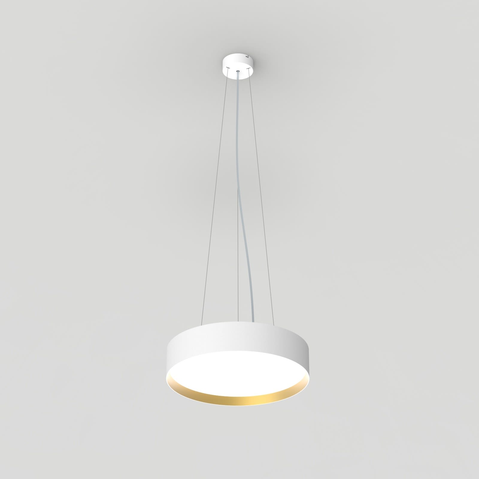 Luminaire LED de grande qualité avec boîtier de luminaire rondé au design plat en aluminium extrudé avec surface thermolaquée avec boîtier en revêtu par poudre RAL9016 blanc fine matte et anneau décoratif 'glaring gold' pour un montage en suspension au centre de la fusion,. Installation par 3 filins de suspension, avec réglage de la longueur. alimentation transparent 1750 mm avec patère blanche en saillie 100x36 mm (d.xh) incl.. Diffuseur en PMMA microprismatique pour une luminance réduite (LRA). Raccordement électrique par 5 pôles utilisés, Luminaire équipé d’une technologie LED innovante avec une efficacité de 95 lm par W et une flux lumineux sortant de 2092 lm lm pour 22 W, en température de couleur 4000 K. Nombre d'adresses DALI : 1. Convertisseur DALI pour gradation, Evaluation de l'éblouissement selon la classification selon DIN EN 12464-1.2021-11 avec UGR < 22, luminaire de poste de travail compatible écran selon DIN EN 12464-1 (luminosité à 65° <= 3000 cd/m²), ’Melanopic Ratio’ = (0,739), Indice de rendu des couleurs (IRC) > 90, tolérance chromatique étroite MacAdam 3, Groupe de risque RG0 selon norme IEC 62471, durée de vie nominale > 60.000 h [selon le décret de l’UE], classe énergétique (EEI). Indice de protection IP50, classe de protection I. Sur demande, également en version éclairage de secours avec batterie de 3h ou dans la version avec capteur de mouvement et de luminosité contrôlable/programmable, Casambi également sur demande. Des télécommandes sont disponibles comme accessoires. L’éclairage d’urgence et le capteur ne peuvent pas être combinés. Option de commutateur : C, source lumineuse remplaçable par le fabricant, dispositif de commande remplaçable par un professionnel autorisé, Dimensions DMxH : 0420x091 mm, hauteur totale du boîtier de 110 mm et hauteur visible de 91 mm, poids : 3,4 kg