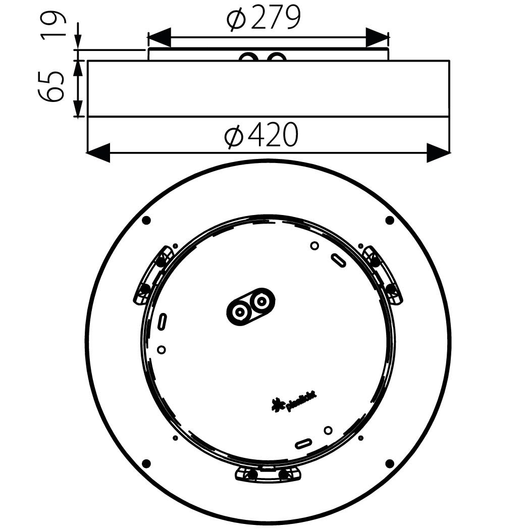 Luminaire LED de grande qualité avec boîtier de luminaire rond au design plat en aluminium extrudé avec surface thermolaquée, et pour éclairage direct. Installation par fixation murale incl.. Diffuseur direct en PMMA satiné pour un éclairage homogène. Raccordement électrique par 5 pôles utilisés, Luminaire équipé d’une technologie LED innovante avec une efficacité de 123 lm par W et une flux lumineux sortant de 3434 lm lm pour 28 W, en température de couleur 4000 K. Nombre d''adresses DALI : 1. Convertisseur DALI pour gradation , Evaluation de l''éblouissement selon la classification selon DIN EN 12464-1.2021-11 avec UGR < 25, ’Melanopic Ratio’ = [0,739], Indice de rendu des couleurs (IRC) > 90, tolérance chromatique étroite MacAdam 3, Groupe de risque RG0 selon norme IEC 62471, durée de vie nominale > 60.000 h [selon le décret de l’UE], classe énergétique (EEI) . Indice de protection IP54, résistance aux chocs IK07 selon norme IEC 62262:2012, classe de protection I. Sur demande, également en version avec capteur de mouvement et de luminosité contrôlable/programmable, Casambi également sur demande. Des télécommandes sont disponibles comme accessoires. Option de commutateur : C, source lumineuse remplaçable par le fabricant, dispositif de commande remplaçable par un professionnel autorisé, Dimensions DMxH : 0420x065 mm, hauteur totale du boîtier de 84 mm, déport du mur (profondeur) = 19 mm, poids : 2.9 kg