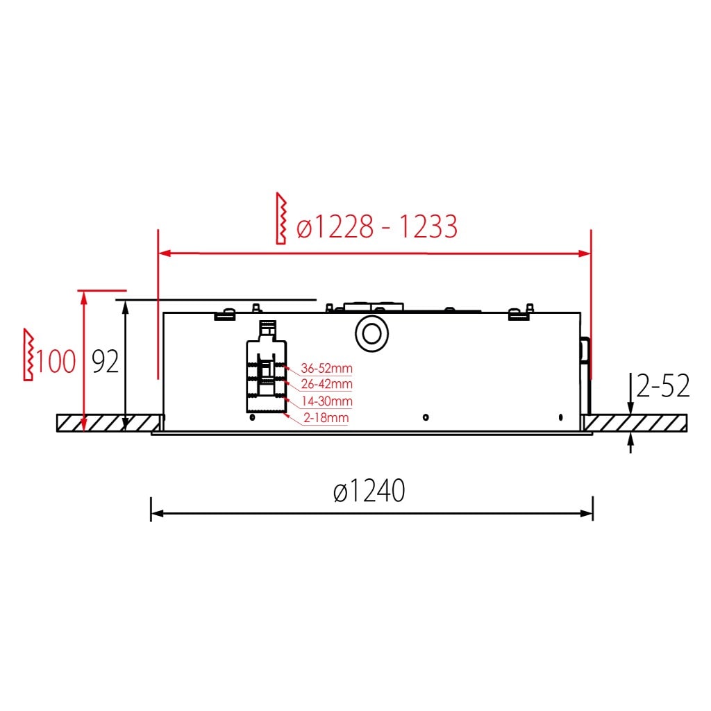 Luminaire LED de grande qualité avec boîtier de luminaire rond au design plat avec collerette ronde élégante en coloris blanc ’RAL9016’, structure fine mate, en aluminium extrudé avec surface thermolaquée, pour montage encastré au ras du plafond de 2 à 52 mm d’épaisseur, et pour éclairage direct. Installation par avec plaques de montage spéciales pour faciliter l’encastrement. . Diffuseur en PMMA microprismatique pour une luminance réduite (LRA). Raccordement électrique par 5 pôles utilisés, Luminaire équipé d’une technologie LED innovante avec une efficacité de 123 lm par W et une flux lumineux sortant de 28419 lm lm pour 231 W, en température de couleur 4000 K. Nombre d''adresses DALI : 3. Convertisseur DALI pour gradation , Evaluation de l''éblouissement selon la classification selon DIN EN 12464-1.2021-11 avec UGR < 22, ’Melanopic Ratio’ = [0,739], Indice de rendu des couleurs (IRC) > 90, tolérance chromatique étroite MacAdam 3, Groupe de risque RG0 selon norme IEC 62471, durée de vie nominale > 60.000 h [selon le décret de l’UE], classe énergétique (EEI) . Indice de protection IP20, résistance aux chocs IK07 selon norme IEC 62262:2012, classe de protection I. Sur demande, également en version éclairage de secours avec batterie de 3h ou dans la version avec capteur de mouvement et de luminosité contrôlable/programmable, Casambi également sur demande. Des télécommandes sont disponibles comme accessoires. L'éclairage d'urgence et le capteur ne peuvent pas être combinés. Option de commutateur : C, source lumineuse remplaçable par un professionnel autorisé, dispositif de commande remplaçable par un professionnel autorisé, Dimensions DMxH : 1240x092 mmDécoupe DMxH : 1228 - 1233x100 mm, poids : 28.1 kg