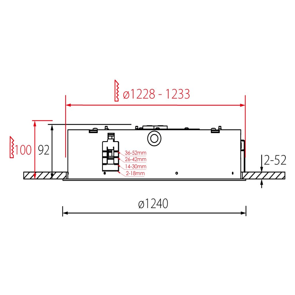 Luminaire LED de grande qualité avec boîtier de luminaire rond au design plat avec collerette ronde élégante en coloris noir ’RAL9005’, structure fine mate, en aluminium extrudé avec surface thermolaquée, pour montage encastré au ras du plafond de 2 à 52 mm d’épaisseur, et pour éclairage direct. Installation par avec plaques de montage spéciales pour faciliter l’encastrement. . Diffuseur en PMMA microprismatique pour une luminance réduite (LRA). Raccordement électrique par 5 pôles utilisés, Luminaire équipé d’une technologie LED innovante avec une efficacité de 109 lm par W et une flux lumineux sortant de 25226 lm lm pour 231 W, en température de couleur 3000 K. Nombre d''adresses DALI : 3. Convertisseur DALI pour gradation , Evaluation de l''éblouissement selon la classification selon DIN EN 12464-1.2021-11 avec UGR < 22, ’Melanopic Ratio’ = [0,57], Indice de rendu des couleurs (IRC) > 90, tolérance chromatique étroite MacAdam 3, Groupe de risque RG0 selon norme IEC 62471, durée de vie nominale > 60.000 h [selon le décret de l’UE], classe énergétique (EEI) . Indice de protection IP20, résistance aux chocs IK07 selon norme IEC 62262:2012, classe de protection I. Sur demande, également en version éclairage de secours avec batterie de 3h ou dans la version avec capteur de mouvement et de luminosité contrôlable/programmable, Casambi également sur demande. Des télécommandes sont disponibles comme accessoires. L'éclairage d'urgence et le capteur ne peuvent pas être combinés. Option de commutateur : C, source lumineuse remplaçable par un professionnel autorisé, dispositif de commande remplaçable par un professionnel autorisé, Dimensions DMxH : 1240x092 mmDécoupe DMxH : 1228 - 1233x100 mm, poids : 28.1 kg