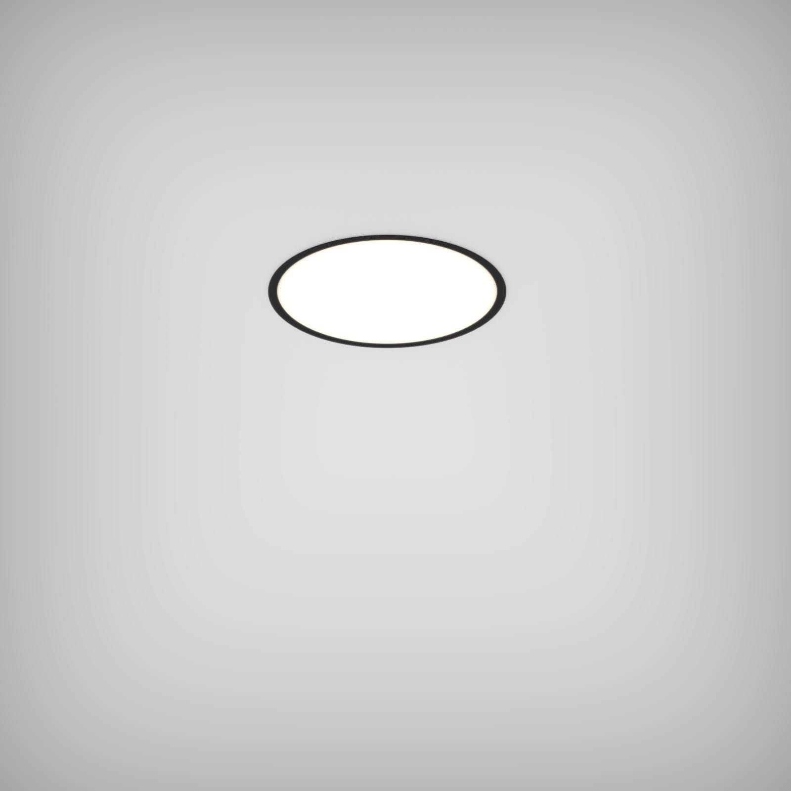 Luminaire LED de grande qualité avec boîtier de luminaire rond au design plat avec collerette ronde élégante en coloris noir ’RAL9005’, structure fine mate, en aluminium extrudé avec surface thermolaquée, pour montage encastré au ras du plafond de 2 à 52 mm d’épaisseur, et pour éclairage direct. Installation par avec plaques de montage spéciales pour faciliter l’encastrement. . Diffuseur en PMMA microprismatique pour une luminance réduite (LRA). Raccordement électrique par 5 pôles utilisés, Luminaire équipé d’une technologie LED innovante avec une efficacité de 76 lm par W et une flux lumineux sortant de 2127 lm lm pour 28 W, en température de couleur 3000 K. Pour maximiser la sortie en lumens, un boost d'efficacité du réflecteur spécialement conçu est disponible en tant qu'accessoire à monter ultérieurement : en l'utilisant (en option), le flux lumineux passe à 2948 lm, l'efficacité peut être augmentée à 105 lm/W . Nombre d''adresses DALI : 1. Convertisseur DALI pour gradation , Evaluation de l''éblouissement selon la classification selon DIN EN 12464-1.2021-11 avec UGR < 22, ’Melanopic Ratio’ = [0,57], Indice de rendu des couleurs (IRC) > 90, tolérance chromatique étroite MacAdam 3, Groupe de risque RG0 selon norme IEC 62471, durée de vie nominale > 60.000 h [selon le décret de l’UE], classe énergétique (EEI) . Indice de protection IP20, résistance aux chocs IK07 selon norme IEC 62262:2012, classe de protection I. Sur demande, également en version éclairage de secours avec batterie de 3h ou dans la version avec capteur de mouvement et de luminosité contrôlable/programmable, Casambi également sur demande. Des télécommandes sont disponibles comme accessoires. L'éclairage d'urgence et le capteur ne peuvent pas être combinés. Option de commutateur : C, source lumineuse remplaçable par un professionnel autorisé, dispositif de commande remplaçable par un professionnel autorisé, Dimensions DMxH : 0440x092 mmDécoupe DMxH : 428 - 433x100 mm, poids : 4.4 kg
