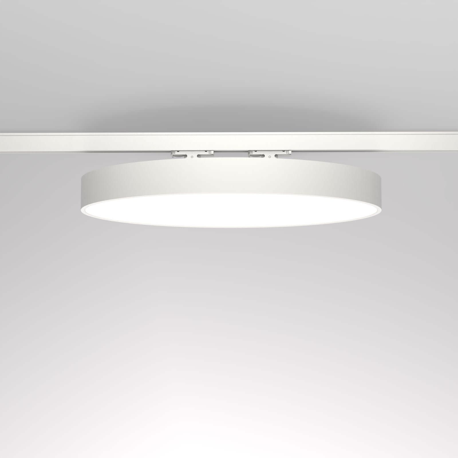 Luminaire LED de grande qualité avec boîtier de luminaire rond au design plat en aluminium extrudé avec surface thermolaquée, pour le montage sur un rail triphasé, et pour éclairage direct/indirect. Installation par 2 x adaptateur DALI Stucchi ONEtrack/Global pulse blanc et sur CLICK&PLAY-canopée. Diffuseur direct en polycarbonate microprismatique pour une luminance réduite (LRA), indirect en PMMA satiné. Luminaire équipé d’une technologie LED innovante avec une efficacité de 132 lm par W et une flux lumineux sortant de 6718 lm lm pour 51 W, en température de couleur 4000 K. Nombre d''adresses DALI : 1. Convertisseur DALI pour gradation , Evaluation de l''éblouissement selon la classification selon DIN EN 12464-1.2021-11 avec UGR < 22, ’Melanopic Ratio’ = [0,739], Indice de rendu des couleurs (IRC) > 90, tolérance chromatique étroite MacAdam 3, Groupe de risque RG0 selon norme IEC 62471, durée de vie nominale > 60.000 h [selon le décret de l’UE], classe énergétique (EEI) . Indice de protection IP50, classe de protection I. Sur demande, également en version éclairage de secours avec batterie de 3h ou dans la version avec capteur de mouvement et de luminosité contrôlable/programmable, Casambi également sur demande. Des télécommandes sont disponibles comme accessoires. L'éclairage d'urgence et le capteur ne peuvent pas être combinés. Option de commutateur : C, source lumineuse remplaçable par le fabricant, dispositif de commande remplaçable par un professionnel autorisé, Dimensions DMxH : 0620x065 mm, hauteur totale du boîtier de 84 mm, hauteur du baldaquin 19, hauteur visible 65 mm, hauteur des adaptateurs de rails 48 mm, poids : 5.2 kg