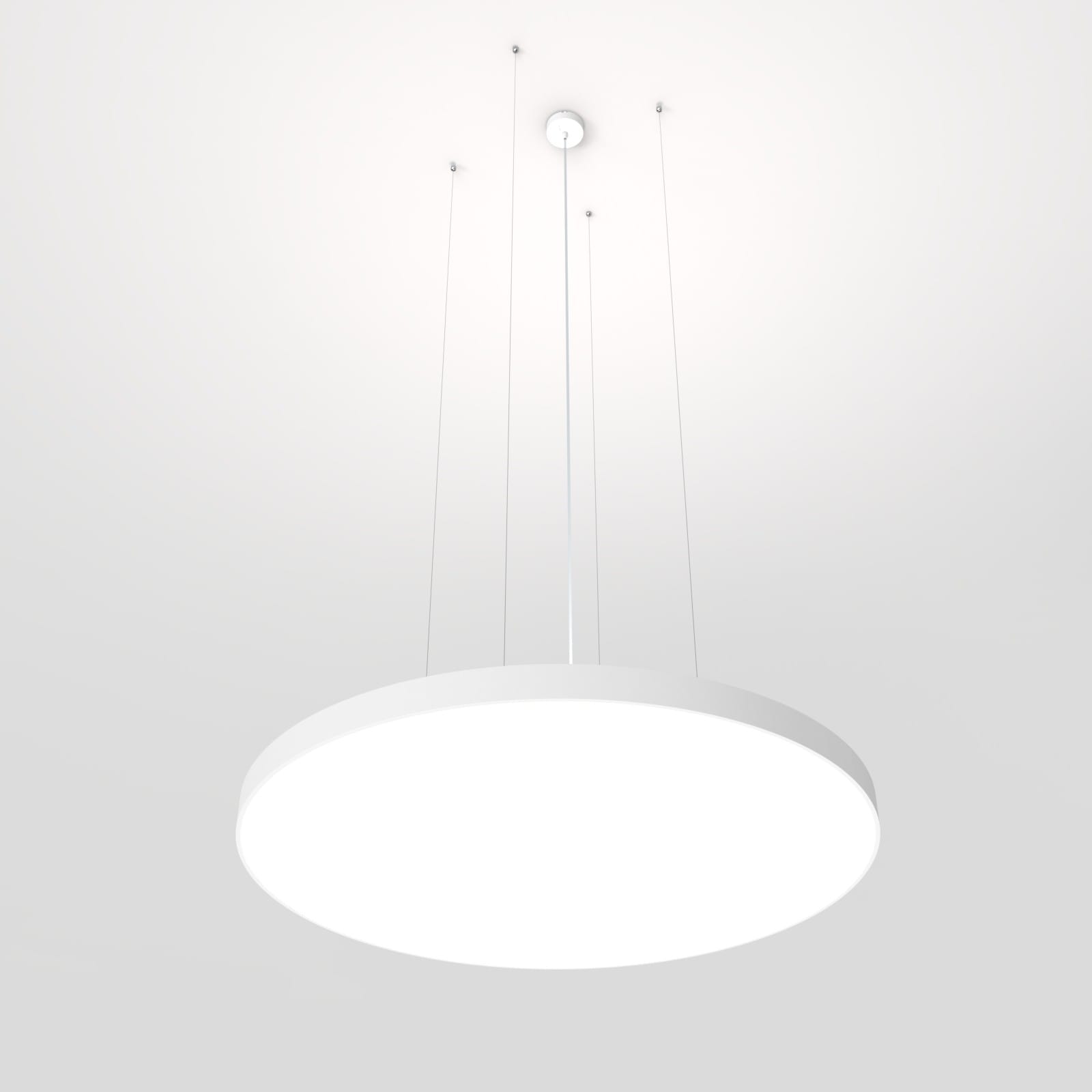 Luminaire LED de grande qualité avec boîtier de luminaire rond au design plat en aluminium extrudé avec surface thermolaquéeen blanc ’RAL9016’, structure fine mate, pour montage en suspension, et pour éclairage direct/indirect. Installation par 4 filins de suspension 1500 mm avec tendeurs rapides, avec réglage de la longueur. alimentation transparent 1750 mm avec patère blanche en saillie 100x36 mm (d.xh) incl.. Diffuseur direct en polycarbonate microprismatique pour une luminance réduite (LRA), indirect en PMMA satiné. Raccordement électrique par 5 pôles utilisés, Luminaire équipé d’une technologie LED innovante avec une efficacité de 125 lm par W et une flux lumineux sortant de 37741 lm lm pour 301 W, en température de couleur 4000 K. Nombre d''adresses DALI : 4. Convertisseur DALI pour gradation , Evaluation de l''éblouissement selon la classification selon DIN EN 12464-1.2021-11 avec UGR < 19, ’Melanopic Ratio’ = [0,739], Indice de rendu des couleurs (IRC) > 90, tolérance chromatique étroite MacAdam 3, Groupe de risque RG0 selon norme IEC 62471, durée de vie nominale > 60.000 h [selon le décret de l’UE], classe énergétique (EEI) . Indice de protection IP50, résistance aux chocs IK07 selon norme IEC 62262:2012, classe de protection I. Sur demande, également en version avec capteur de mouvement et de luminosité contrôlable/programmable, Casambi également sur demande. Des télécommandes sont disponibles comme accessoires. Des câbles design de différentes longueurs et couleurs sont disponibles en option pour l’alimentation, Option de commutateur : C, source lumineuse remplaçable par le fabricant, dispositif de commande remplaçable par un professionnel autorisé, Dimensions DMxH : 1220x065 mm, hauteur totale du boîtier de 84 mm et hauteur visible de 65 mm, poids : 26.8 kg