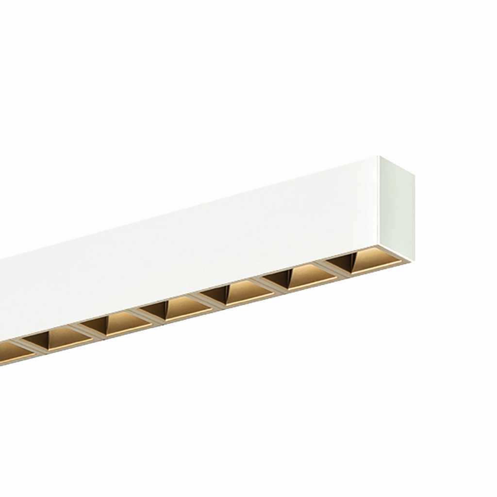 Nouveau luminaire de bureau profilé LED de grande qualité, en aluminium extrudé avec surface thermolaquée en blanc ’RAL9016’ pour le montage en saillie, et l’éclairage direct. Diffusion directe de la lumière par Grille 'glaring gold'. Convertisseur DALI pour gradation inclus. Luminaire équipé d’une technologie LED innovante avec une efficacité de 76 lm par W et une flux lumineux sortant de 3571lm pour 47 W, en température de couleur 4000 K (nominale), 3893 K (effective). Evaluation de l'éblouissement selon la classification selon DIN EN 12464-1.2021-11 avec UGR < 16, luminaire de poste de travail compatible écran selon DIN EN 12464-1 (luminosité à 65° <= 3000 cd/m²), indice de rendu des couleurs (IRC) > 90, indice de protection IP20, classe de protection I, Groupe de risque RG0 selon norme IEC 62471, durée de vie nominale > 60.000 h [selon le décret de l’UE]. Sur demande également en version d’éclairage d’urgence, batterie 3h. Option de commutateur : C, source lumineuse remplaçable par le fabricant, dispositif de commande remplaçable par un professionnel autorisé, Dimensions LxlxH : 1404x50x071 mm, hauteur de profil de 66 mm, joint creux de 5 mm, embouts inclus, poids : 3,6 kg